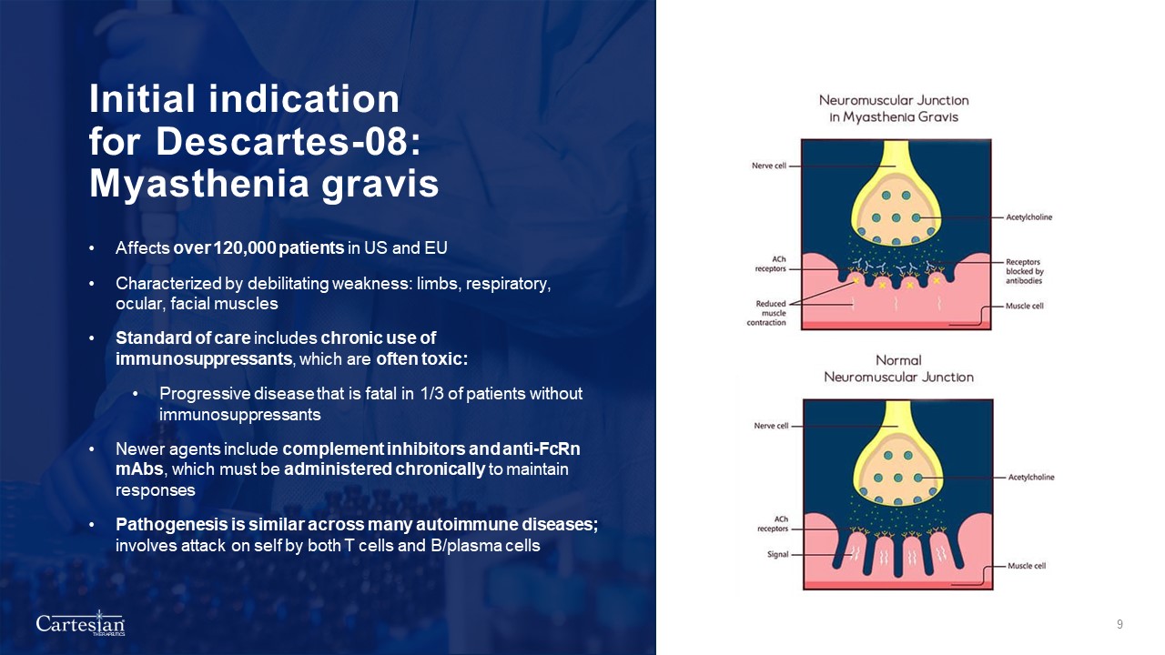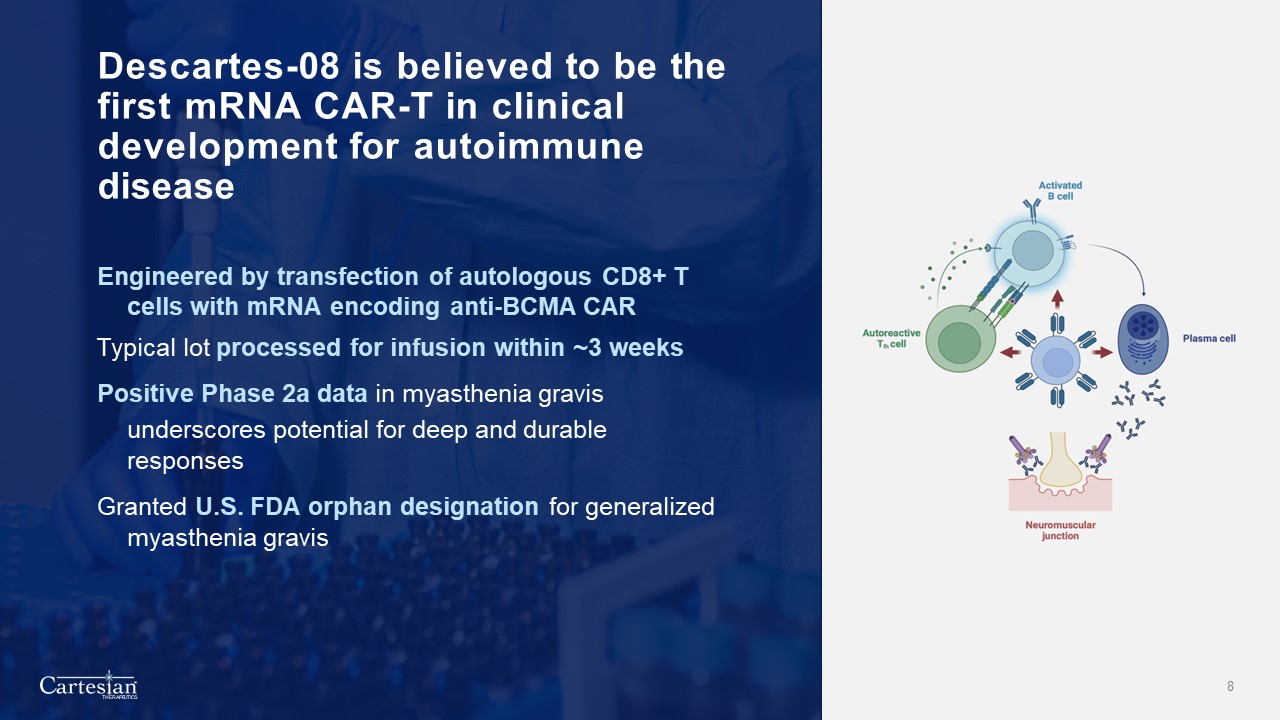 ®  THERAPEUTICS  8  Descartes-08 is believed to be the first mRNA CAR-T in clinical  development for autoimmune  disease  Engineered by transfection of autologous CD8+ T cells with mRNA encoding anti-BCMA CAR  Typical lot processed for infusion within ~3 weeks Positive Phase 2a data in myasthenia gravis  underscores potential for deep and durable responses  Granted U.S. FDA orphan designation for generalized myasthenia gravis