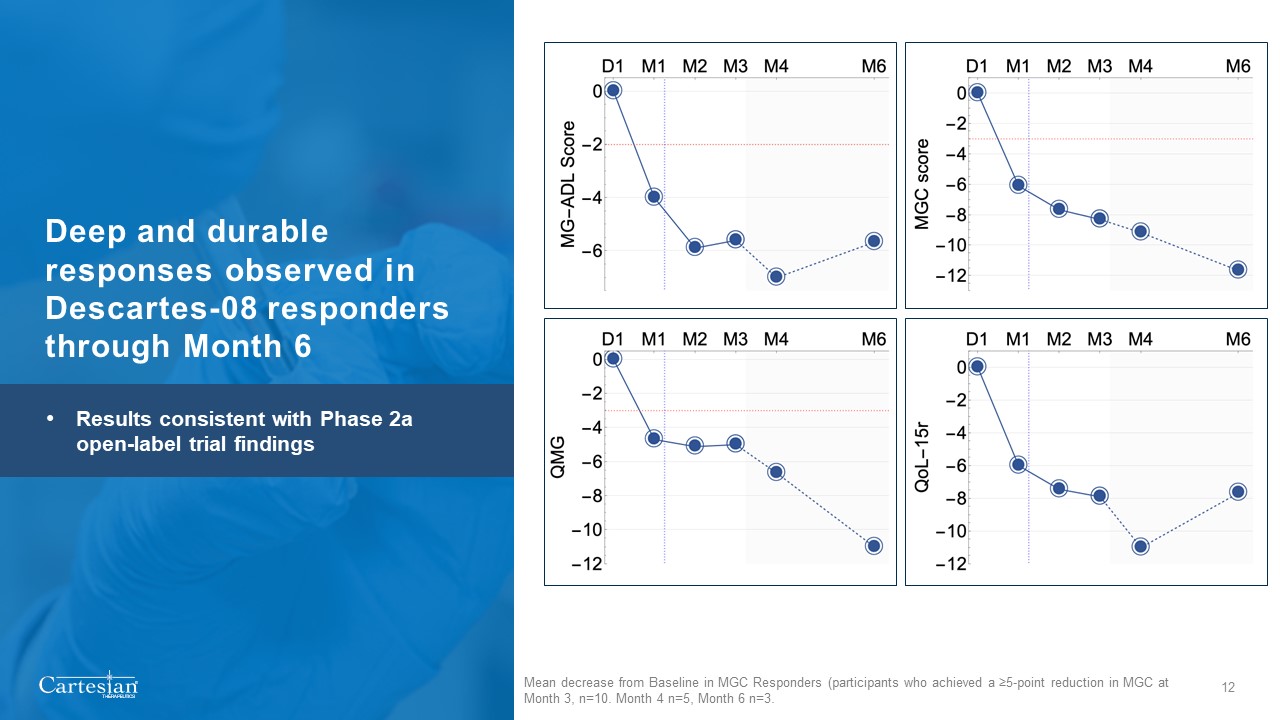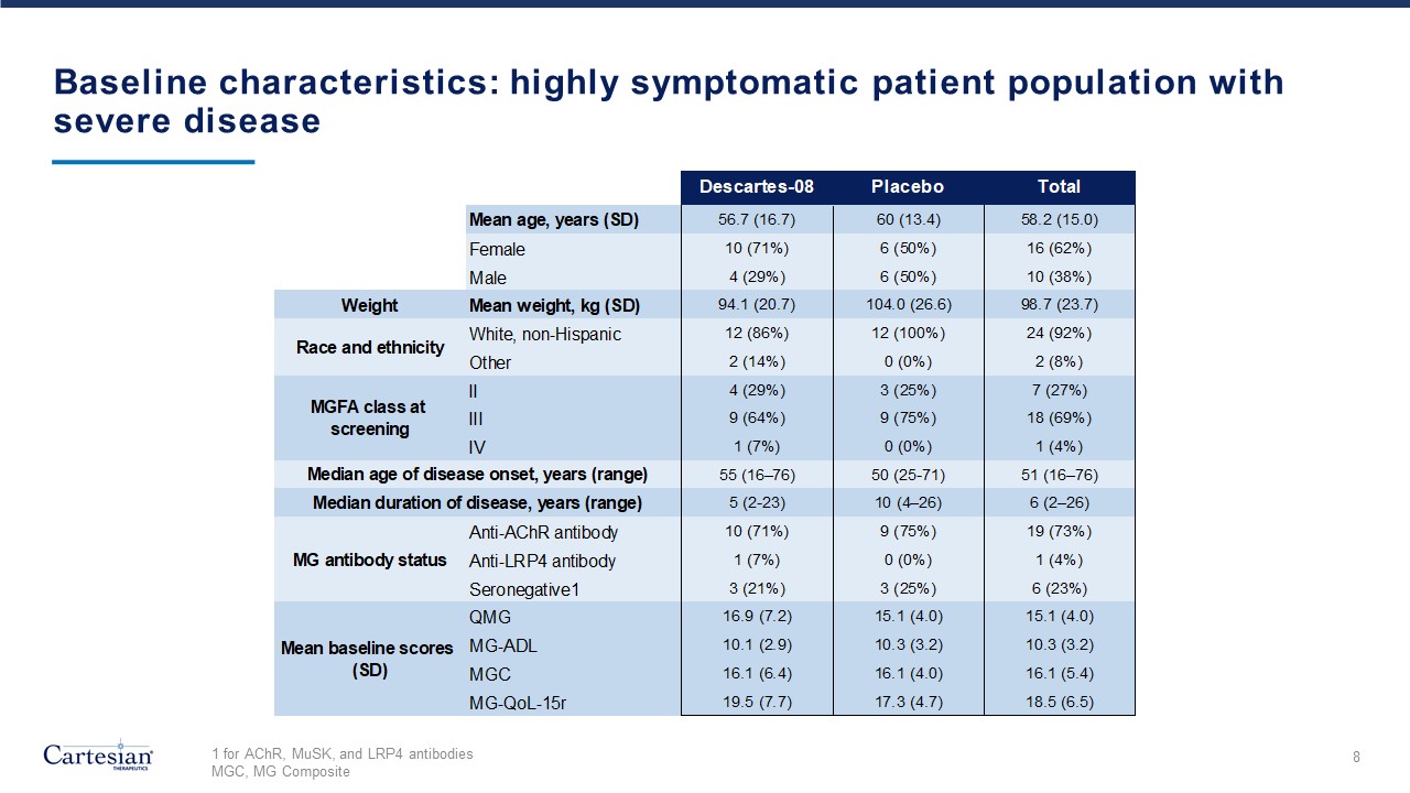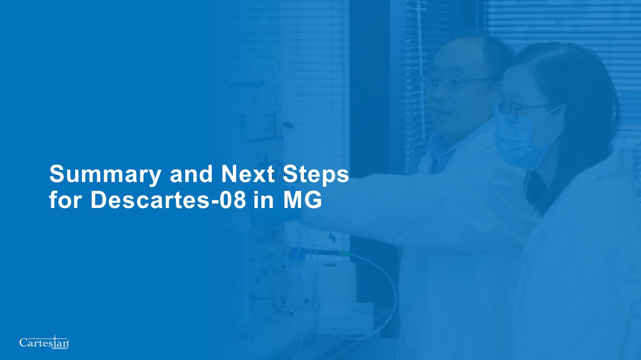 14 patients received Descartes-08 and 12 patients received placebo in the pre-specified primary efficacy dataset  27  Academic medical centers  9  Community clinics  1  Early drop-out  26  Primary efficacy dataset  14  Randomized to Descartes-08  12  Randomized toplacebo  5  Randomized to Descartes-08  4  Randomized toplacebo  Consistent with current IND, primary efficacy dataset includes modified ITT population enrolled at academic medical centers qualified for MG Composite assessment with at least one post-baseline follow-up.  Safety dataset includes all participants at academic medical centers and community clinics who received at least one dose of Descartes-08 or placebo.  7  36 patients randomized 1:1  IND, Investigational New Drug Application  ITT, Intention to Treat
