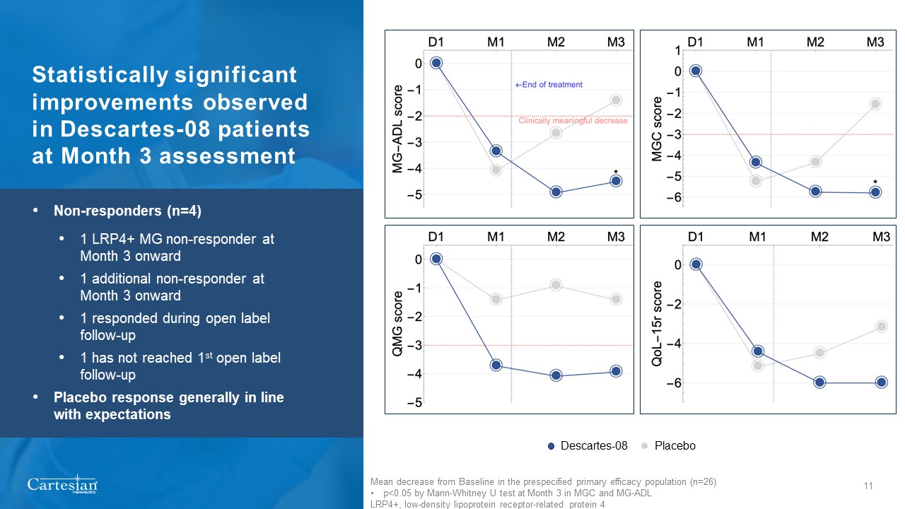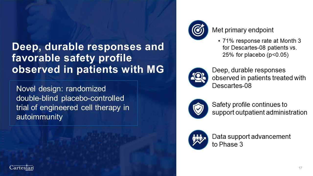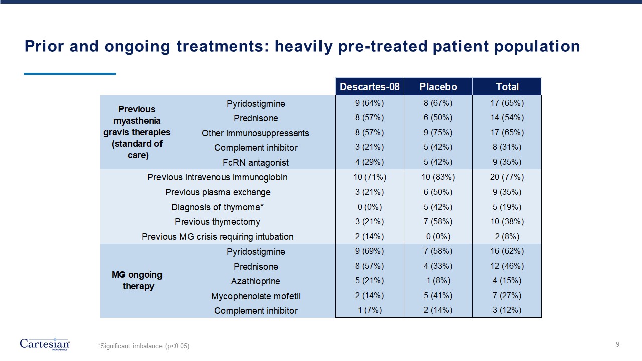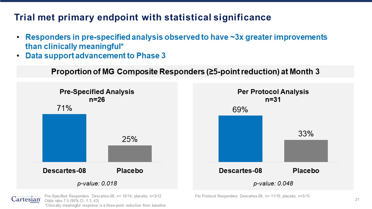 14 patients received Descartes-08 and 12 patients received placebo in the pre-specified primary efficacy dataset  27  Academic medical centers  9  Community clinics  1  Early drop-out  26  Primary efficacy dataset  14  Randomized to Descartes-08  12  Randomized toplacebo  5  Randomized to Descartes-08  4  Randomized toplacebo  Consistent with current IND, primary efficacy dataset includes modified ITT population enrolled at academic medical centers qualified for MG Composite assessment with at least one post-baseline follow-up.  Safety dataset includes all participants at academic medical centers and community clinics who received at least one dose of Descartes-08 or placebo.  7  36 patients randomized 1:1  IND, Investigational New Drug Application  ITT, Intention to Treat