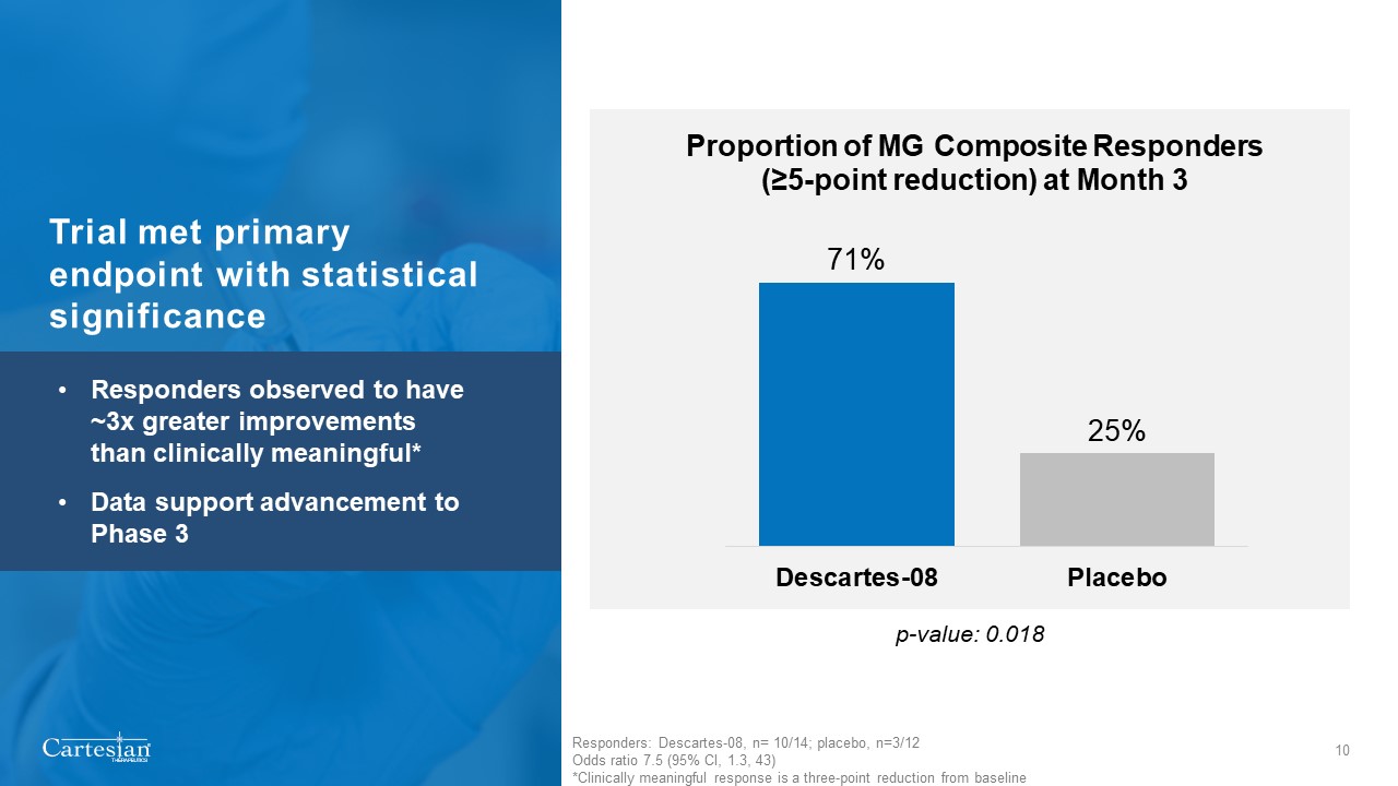 Trial met primary endpoint with statistical significance  10  p-value: 0.018   Responders: Descartes-08, n= 10/14; placebo, n=3/12  Odds ratio 7.5 (95% CI, 1.3, 43)  *Clinically meaningful response is a three-point reduction from baseline  Responders observed to have ~3x greater improvements than clinically meaningful*  Data support advancement to Phase 3
