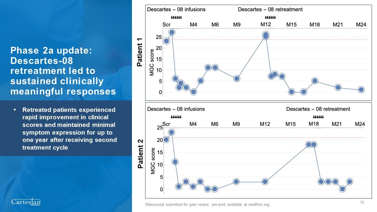 Phase 2a update:Descartes-08 retreatment led to sustained clinically meaningful responses  Manuscript submitted for peer review; pre-print available at medRxiv.org  Patient 1  Patient 2  15  Retreated patients experienced rapid improvement in clinical scores and maintained minimal symptom expression for up to one year after receiving second treatment cycle