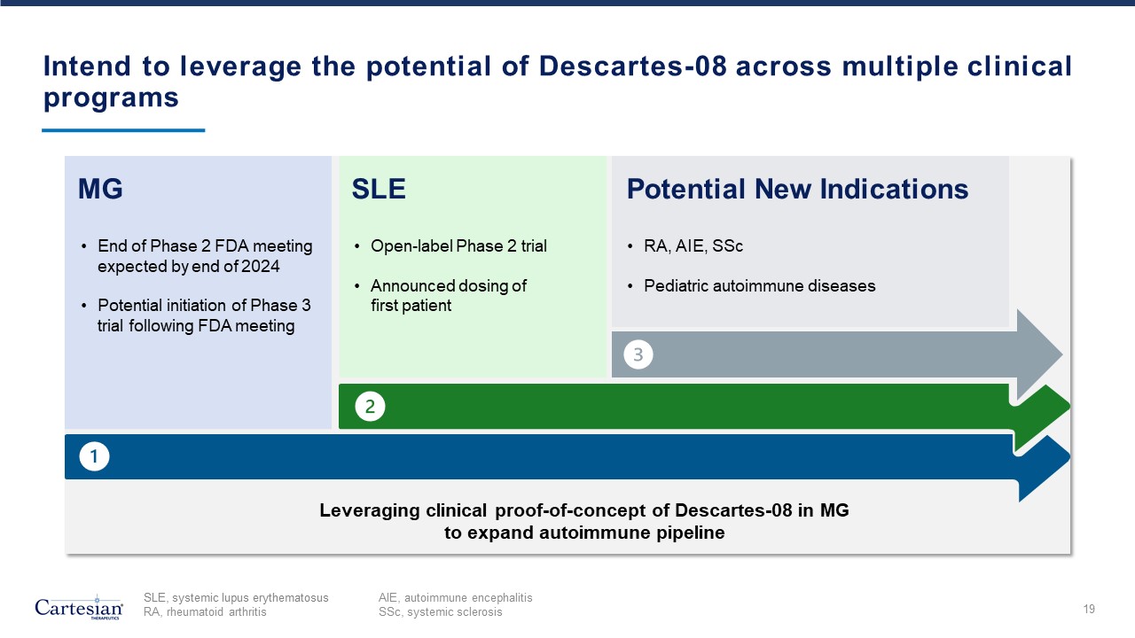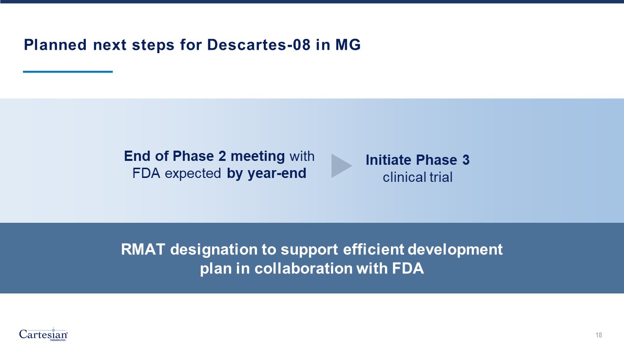Planned next steps for Descartes-08 in MG  18  End of Phase 2 meeting with FDA expected by year-end  Initiate Phase 3 clinical trial  RMAT designation to support efficient development plan in collaboration with FDA