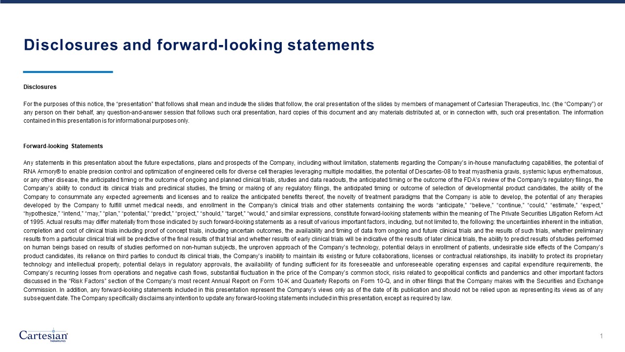 Disclosures and forward-looking statements  Disclosures  For the purposes of this notice, the “presentation” that follows shall mean and include the slides that follow, the oral presentation of the slides by members of management of Cartesian Therapeutics, Inc. (the “Company”) or any person on their behalf, any question-and-answer session that follows such oral presentation, hard copies of this document and any materials distributed at, or in connection with, such oral presentation. The information contained in this presentation is for informational purposes only.   Forward-looking Statements  Any statements in this presentation about the future expectations, plans and prospects of the Company, including without limitation, statements regarding the Company’s in-house manufacturing capabilities, the potential of RNA Armory® to enable precision control and optimization of engineered cells for diverse cell therapies leveraging multiple modalities, the potential of Descartes-08 to treat myasthenia gravis, systemic lupus erythematosus, or any other disease, the anticipated timing or the outcome of ongoing and planned clinical trials, studies and data readouts, the anticipated timing or the outcome of the FDA’s review of the Company’s regulatory filings, the Company’s ability to conduct its clinical trials and preclinical studies, the timing or making of any regulatory filings, the anticipated timing or outcome of selection of developmental product candidates, the ability of the Company to consummate any expected agreements and licenses and to realize the anticipated benefits thereof, the novelty of treatment paradigms that the Company is able to develop, the potential of any therapies developed by the Company to fulfill unmet medical needs, and enrollment in the Company’s clinical trials and other statements containing the words “anticipate,” “believe,” “continue,” “could,” “estimate,” “expect,” “hypothesize,” “intend,” “may,” “plan,” “potential,” “predict,” “project,” “should,” “target,” “would,” and similar expressions, constitute forward-looking statements within the meaning of The Private Securities Litigation Reform Act of 1995. Actual results may differ materially from those indicated by such forward-looking statements as a result of various important factors, including, but not limited to, the following: the uncertainties inherent in the initiation, completion and cost of clinical trials including proof of concept trials, including uncertain outcomes, the availability and timing of data from ongoing and future clinical trials and the results of such trials, whether preliminary results from a particular clinical trial will be predictive of the final results of that trial and whether results of early clinical trials will be indicative of the results of later clinical trials, the ability to predict results of studies performed on human beings based on results of studies performed on non-human subjects, the unproven approach of the Company’s technology, potential delays in enrollment of patients, undesirable side effects of the Company’s product candidates, its reliance on third parties to conduct its clinical trials, the Company’s inability to maintain its existing or future collaborations, licenses or contractual relationships, its inability to protect its proprietary technology and intellectual property, potential delays in regulatory approvals, the availability of funding sufficient for its foreseeable and unforeseeable operating expenses and capital expenditure requirements, the Company’s recurring losses from operations and negative cash flows, substantial fluctuation in the price of the Company’s common stock, risks related to geopolitical conflicts and pandemics and other important factors discussed in the “Risk Factors” section of the Company’s most recent Annual Report on Form 10-K and Quarterly Reports on Form 10-Q, and in other filings that the Company makes with the Securities and Exchange Commission. In addition, any forward-looking statements included in this presentation represent the Company’s views only as of the date of its publication and should not be relied upon as representing its views as of any subsequent date. The Company specifically disclaims any intention to update any forward-looking statements included in this presentation, except as required by law.  1