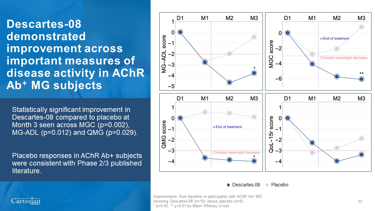 Trial met primary endpoint with statistical significance  Responders in pre-specified analysis observed to have ~3x greater improvements than clinically meaningful*  Data support advancement to Phase 3  Pre-Specified Responders: Descartes-08, n= 10/14; placebo, n=3/12  Odds ratio 7.5 (95% CI, 1.3, 43)  *Clinically meaningful response is a three-point reduction from baseline  Proportion of MG Composite Responders (≥5-point reduction) at Month 3  p-value: 0.018   Per Protocol Responders: Descartes-08, n= 11/16; placebo, n=5/15  p-value: 0.048   21