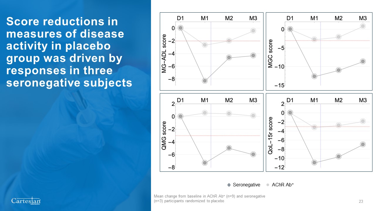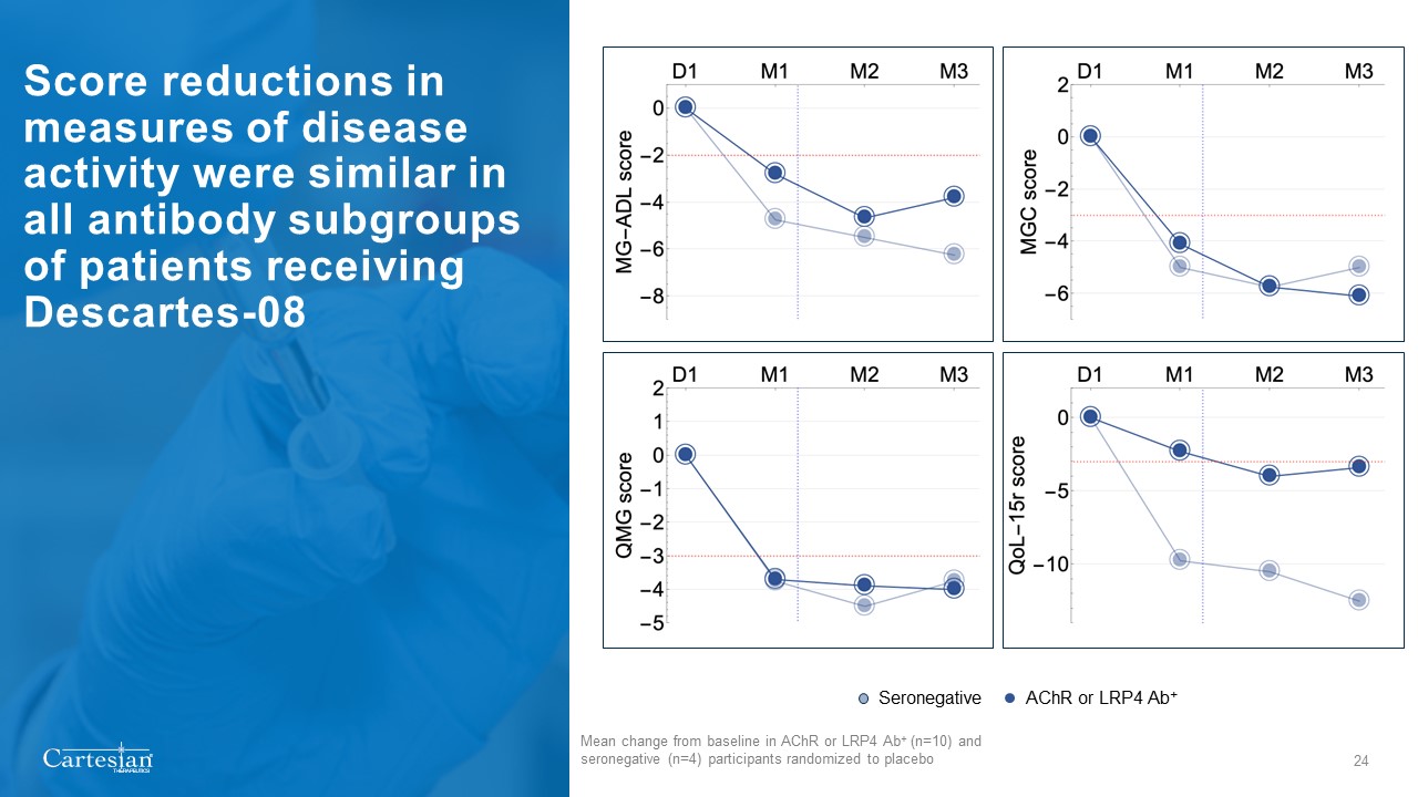 24  Score reductions in measures of disease activity were similar in all antibody subgroups of patients receiving Descartes-08  Seronegative  AChR or LRP4 Abᐩ  Mean change from baseline in AChR or LRP4 Abᐩ (n=10) and seronegative (n=4) participants randomized to placebo