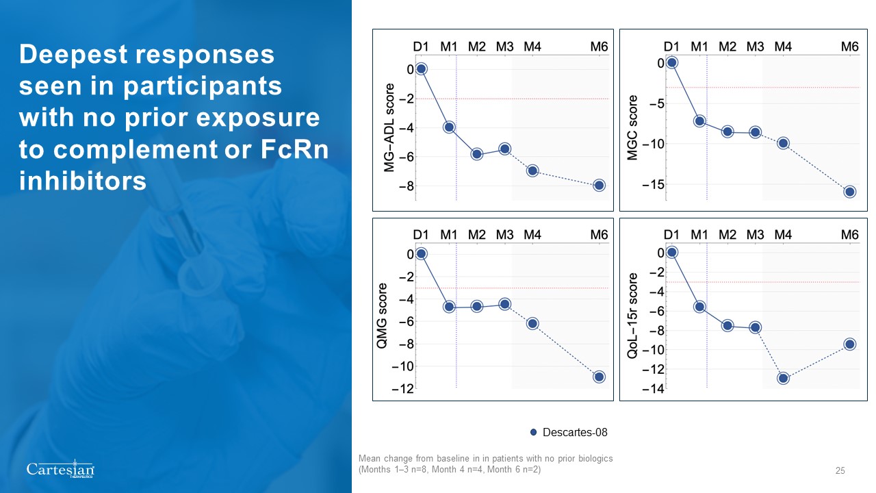 25  Descartes-08  Deepest responses seen in participants with no prior exposure to complement or FcRn inhibitors   Mean change from baseline in in patients with no prior biologics (Months 1–3 n=8, Month 4 n=4, Month 6 n=2)