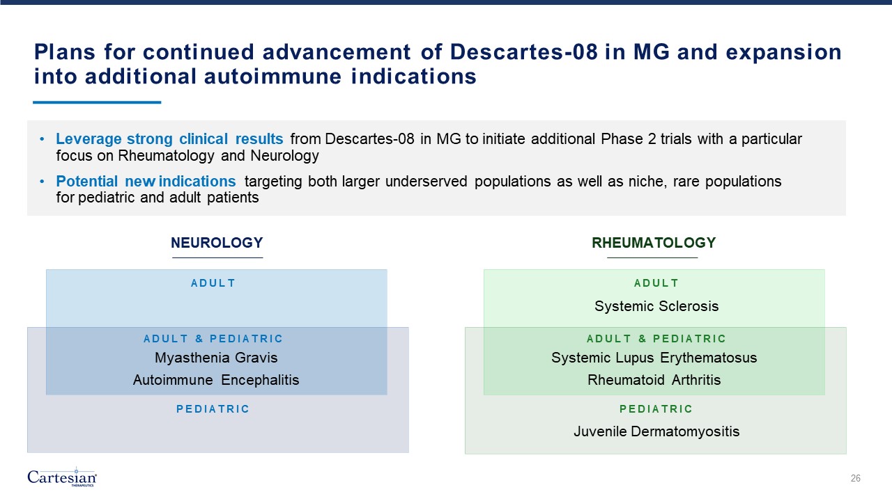 Plans for continued advancement of Descartes-08 in MG and expansion into additional autoimmune indications   Leverage strong clinical results from Descartes-08 in MG to initiate additional Phase 2 trials with a particular focus on Rheumatology and Neurology  Potential new indications targeting both larger underserved populations as well as niche, rare populations for pediatric and adult patients  26  ADULT  PEDIATRIC  ADULT  PEDIATRIC  ADULT & PEDIATRIC  ADULT & PEDIATRIC  Myasthenia Gravis  Autoimmune Encephalitis   Systemic Lupus Erythematosus  Rheumatoid Arthritis  Systemic Sclerosis   Juvenile Dermatomyositis  NEUROLOGY  RHEUMATOLOGY