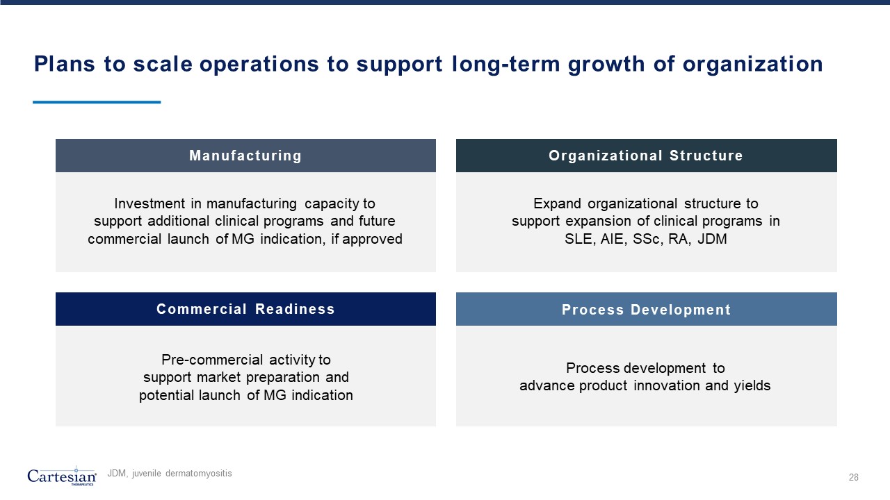 Plans to scale operations to support long-term growth of organization  28  Manufacturing  Organizational Structure  Commercial Readiness  Investment in manufacturing capacity to support additional clinical programs and future commercial launch of MG indication, if approved  Expand organizational structure to support expansion of clinical programs in   SLE, AIE, SSc, RA, JDM   Pre-commercial activity to support market preparation and potential launch of MG indication  Process development to advance product innovation and yields  Process Development  JDM, juvenile dermatomyositis