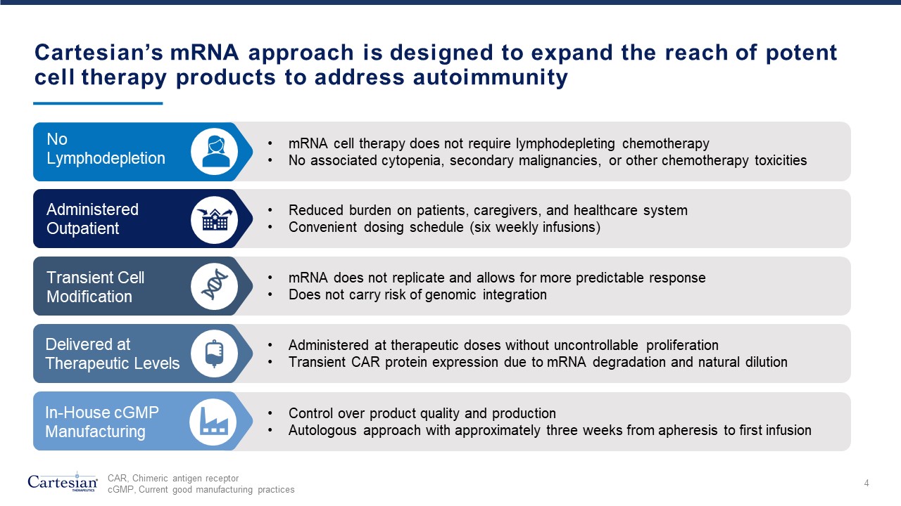 mRNA cell therapy does not require lymphodepleting chemotherapy  No associated cytopenia, secondary malignancies, or other chemotherapy toxicities   Reduced burden on patients, caregivers, and healthcare system  Convenient dosing schedule (six weekly infusions)  Cartesian’s mRNA approach is designed to expand the reach of potent cell therapy products to address autoimmunity  Administered Outpatient  No Lymphodepletion  Administered at therapeutic doses without uncontrollable proliferation  Transient CAR protein expression due to mRNA degradation and natural dilution   Delivered at Therapeutic Levels  mRNA does not replicate and allows for more predictable response  Does not carry risk of genomic integration  Transient Cell Modification  Control over product quality and production  Autologous approach with approximately three weeks from apheresis to first infusion  In-House cGMP Manufacturing  CAR, Chimeric antigen receptor  cGMP, Current good manufacturing practices  4