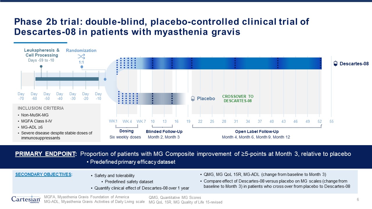 Day-70  Day-60  Day-50  Day-40  Day-30  Day-20  Day-10  Phase 2b trial: double-blind, placebo-controlled clinical trial of Descartes-08 in patients with myasthenia gravis  Leukapheresis & Cell Processing  Days -59 to -10  Randomization  WK1  WK 4  WK 7  10  13  16  19  22  25  28  31  34  37  Dosing  Six weekly doses  Blinded Follow-Up  Month 2, Month 3  Descartes-08  Open Label Follow-Up  Month 4, Month 6, Month 9, Month 12  6  INCLUSION CRITERIA  Non-MuSK-MG   MGFA Class II-IV   MG-ADL ≥6  Severe disease despite stable doses of immunosuppressants   PRIMARY ENDPOINT: Proportion of patients with MG Composite improvement of ≥5-points at Month 3, relative to placebo  Predefined primary efficacy dataset  SECONDARY OBJECTIVES:  1:1  40  43  46  49  52  55  Placebo  CROSSOVER TO DESCARTES-08  Safety and tolerability  Predefined safety dataset  Quantify clinical effect of Descartes-08 over 1 year  QMG, MG QoL 15R, MG-ADL (change from baseline to Month 3)  Compare effect of Descartes-08 versus placebo on MG scales (change from baseline to Month 3) in patients who cross over from placebo to Descartes-08  MGFA, Myasthenia Gravis Foundation of America  MG-ADL, Myasthenia Gravis Activities of Daily Living scale  QMG, Quantitative MG Scores   MG QoL 15R, MG Quality of Life 15-revised