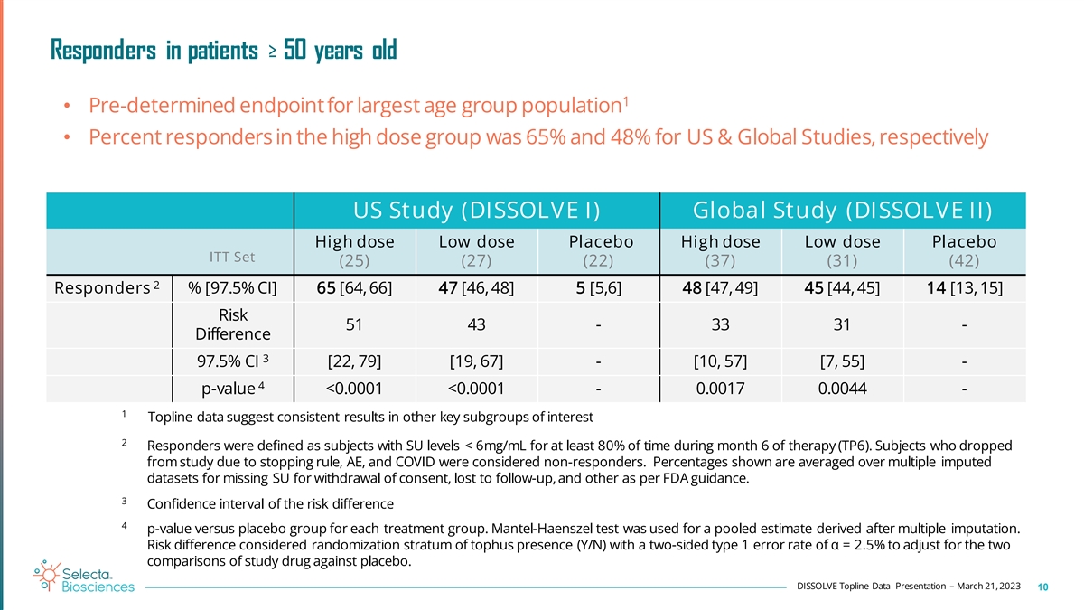 Both studies and tested doses met primary efficacy endpoints • Percent responders in the high dose group was 56% and 47% for US & Global Studies, respectively • Percent responders in the low dose group was 48% and 41% for US & Global Studies, respectively • Results are consistent across multiple modified ITT and per protocol population groups US Study (DISSOLVE I) Global Study (DISSOLVE II) High dose Low dose Placebo High dose Low dose Placebo ITT Set (38) (37) (37) (49) (51) (53) 1 Responders % [97.5% CI] 56 [55, 57] 48 [47,48] 4 [3,4] 47 [46, 48] 41 [40, 41] 12 [11,13] Risk 53 44 - 35 28 - Difference 2 97.5% CI [32, 73] [23, 64] - [14, 56] [8, 48] - 3 p-value <0.0001 <0.0001 - 0.0015 - 0.0002 1 Responders were defined as subjects with SU levels < 6mg/mL for at least 80% of time during month 6 of therapy (TP6). Subjec st who dropped from study due to stopping rule, AE, and COVID were considered non-responders. Percentages shown are averaged over multiple imputed datasets for missing SU for withdrawal of consent, lost to follow-up, and other as per FDA guidance. 2 Confidence interval of the risk difference 3 p-value versus placebo group for each treatment group. Mantel-Haenszel test was used for a pooled estimate derived after multiple imputation. Risk difference considered randomization stratum of tophus presence (Y/N) with a two-sided type 1 error rate of α = 2.5% to adjust for the two comparisons of study drug against placebo. DISSOLVE Topline Data Presentation – March 21, 2023 9