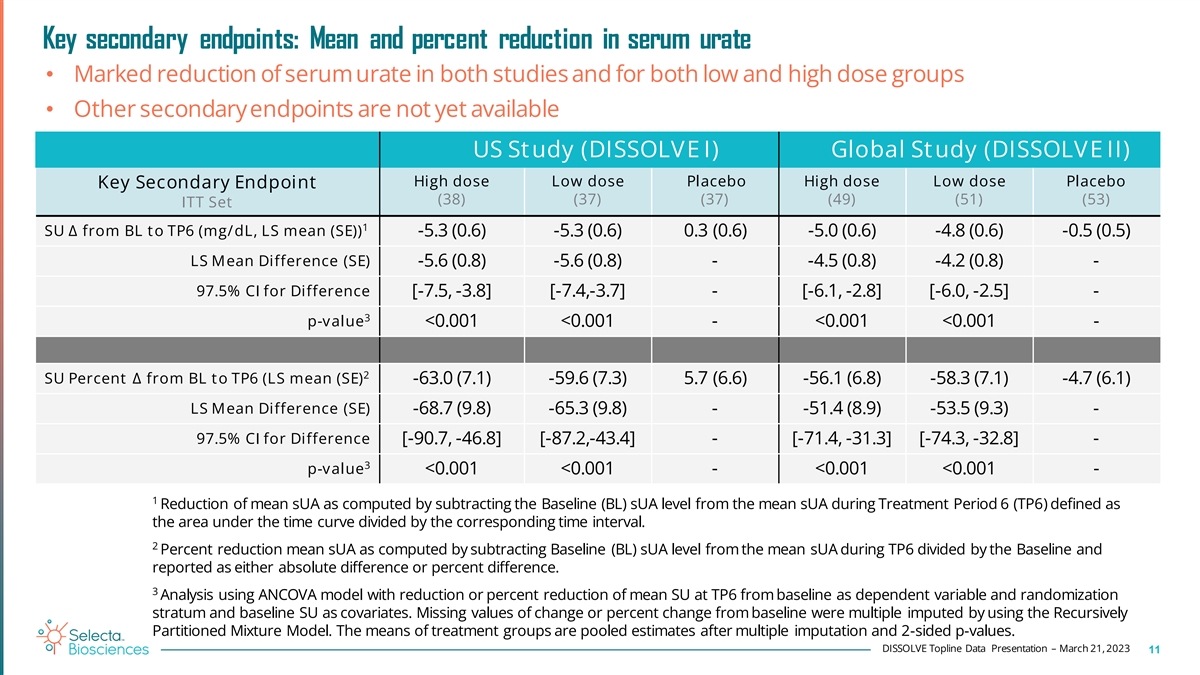Responders in patients ≥ 50 years old 1 • Pre-determined endpoint for largest age group population • Percent responders in the high dose group was 65% and 48% for US & Global Studies, respectively US Study (DISSOLVE I) Global Study (DISSOLVE II) High dose Low dose Placebo High dose Low dose Placebo ITT Set (25) (27) (22) (37) (31) (42) 2 Responders % [97.5% CI] 65 [64, 66] 47 [46, 48] 5 [5,6] 48 [47, 49] 45 [44, 45] 14 [13, 15] Risk 51 43 - 33 31 - Difference 3 97.5% CI [22, 79] [19, 67] - [10, 57] [7, 55] - 4 p-value <0.0001 <0.0001 - 0.0017 0.0044 - 1 Topline data suggest consistent results in other key subgroups of interest 2 Responders were defined as subjects with SU levels < 6mg/mL for at least 80% of time during month 6 of therapy (TP6). Subjec st who dropped from study due to stopping rule, AE, and COVID were considered non-responders. Percentages shown are averaged over multiple imputed datasets for missing SU for withdrawal of consent, lost to follow-up, and other as per FDA guidance. 3 Confidence interval of the risk difference 4 p-value versus placebo group for each treatment group. Mantel-Haenszel test was used for a pooled estimate derived after multiple imputation. Risk difference considered randomization stratum of tophus presence (Y/N) with a two-sided type 1 error rate of α = 2.5% to adjust for the two comparisons of study drug against placebo. DISSOLVE Topline Data Presentation – March 21, 2023 10