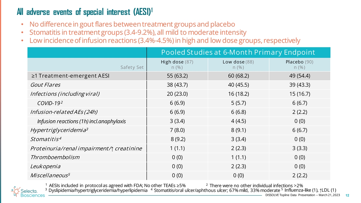 Key secondary endpoints: Mean and percent reduction in serum urate • Marked reduction of serum urate in both studies and for both low and high dose groups • Other secondary endpoints are not yet available US St udy (DISSOLVE I) Global St udy (DISSOLVE II) High dose Low dose Placebo High dose Low dose Placebo Key Secondary Endpoint (38) (37) (37) (49) (51) (53) ITT Set 1 SU ∆ from BL to TP6 (mg/dL, LS mean (SE)) -5.3 (0.6) -5.3 (0.6) 0.3 (0.6) -5.0 (0.6) -4.8 (0.6) -0.5 (0.5) LS M ean Difference (SE) -5.6 (0.8) -5.6 (0.8) - -4.5 (0.8) -4.2 (0.8) - 97.5% CI for Difference [-7.5, -3.8] [-7.4,-3.7] - [-6.1, -2.8] [-6.0, -2.5] - 3 p-value <0.001 <0.001 - <0.001 <0.001 - 2 SU Percent ∆ from BL to TP6 (LS mean (SE) -63.0 (7.1) -59.6 (7.3) 5.7 (6.6) -56.1 (6.8) -58.3 (7.1) -4.7 (6.1) LS M ean Difference (SE) -68.7 (9.8) -65.3 (9.8) - -51.4 (8.9) -53.5 (9.3) - 97.5% CI for Difference [-90.7, -46.8] [-87.2,-43.4] - [-71.4, -31.3] [-74.3, -32.8] - 3 p-value <0.001 <0.001 - <0.001 <0.001 - 1 Reduction of mean sUA as computed by subtracting the Baseline (BL) sUA level from the mean sUA during Treatment Period 6 (TP6) defined as the area under the time curve divided by the corresponding time interval. 2 Percent reduction mean sUA as computed by subtracting Baseline (BL) sUA level from the mean sUA during TP6 divided by the Baseline and reported as either absolute difference or percent difference. 3 Analysis using ANCOVA model with reduction or percent reduction of mean SU at TP6 from baseline as dependent variable and randomization stratum and baseline SU as covariates. Missing values of change or percent change from baseline were multiple imputed by using the Recursively Partitioned Mixture Model. The means of treatment groups are pooled estimates after multiple imputation and 2-sided p-values. DISSOLVE Topline Data Presentation – March 21, 2023 11