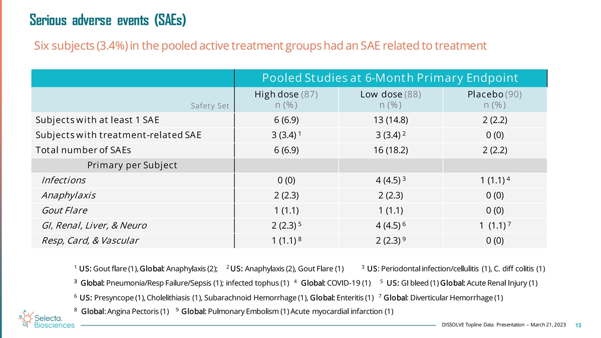 1 All adverse events of special interest (AESI) • No difference in gout flares between treatment groups and placebo • Stomatitis in treatment groups (3.4-9.2%), all mild to moderate intensity • Low incidence of infusion reactions (3.4%-4.5%) in high and low dose groups, respectively Pooled St udies at 6-Mont h Primary Endpoint High dose (87) Low dose (88) Placebo (90) Safety Set n (%) n (%) n (%) ≥1 Treatment -emergent A ESI 55 (63.2) 60 (68.2) 49 (54.4) Gout Flares 38 (43.7) 40 (45.5) 39 (43.3) Infect ions ( including viral) 20 (23.0) 16 (18.2) 15 (16.7) 2 6 (6.9) 5 (5.7) 6 (6.7) COVID-19 Infusion-relat ed AEs ( 24h) 6 (6.9) 6 (6.8) 2 (2.2) 3 (3.4) 4 (4.5) 0 (0) Infusion reactions (1h) incl.anaphylaxis 3 Hypertriglyceridemia 7 (8.0) 8 (9.1) 6 (6.7) 4 Stomatitis 8 (9.2) 3 (3.4) 0 (0) 1 (1.1) 2 (2.3) 3 (3.3) Prot einuria/renal impairment /↑ creatinine Thromboembolism 0 (0) 1 (1.1) 0 (0) Leukopenia 0 (0) 2 (2.3) 0 (0) 5 Miscellaneous 0 (0) 0 (0) 2 (2.2) 1 2 AESIs included in protocol as agreed with FDA; No other TEAEs ≥5% There were no other individual infections >2% 5 3 4 Influenza-like (1), ↑LDL (1) Dyslipidemia/hypertriglyceridemia/hyperlipidemia Stomatitis/oral ulcer/aphthous ulcer; 67% mild, 33% moderate DISSOLVE Topline Data Presentation – March 21, 2023 12