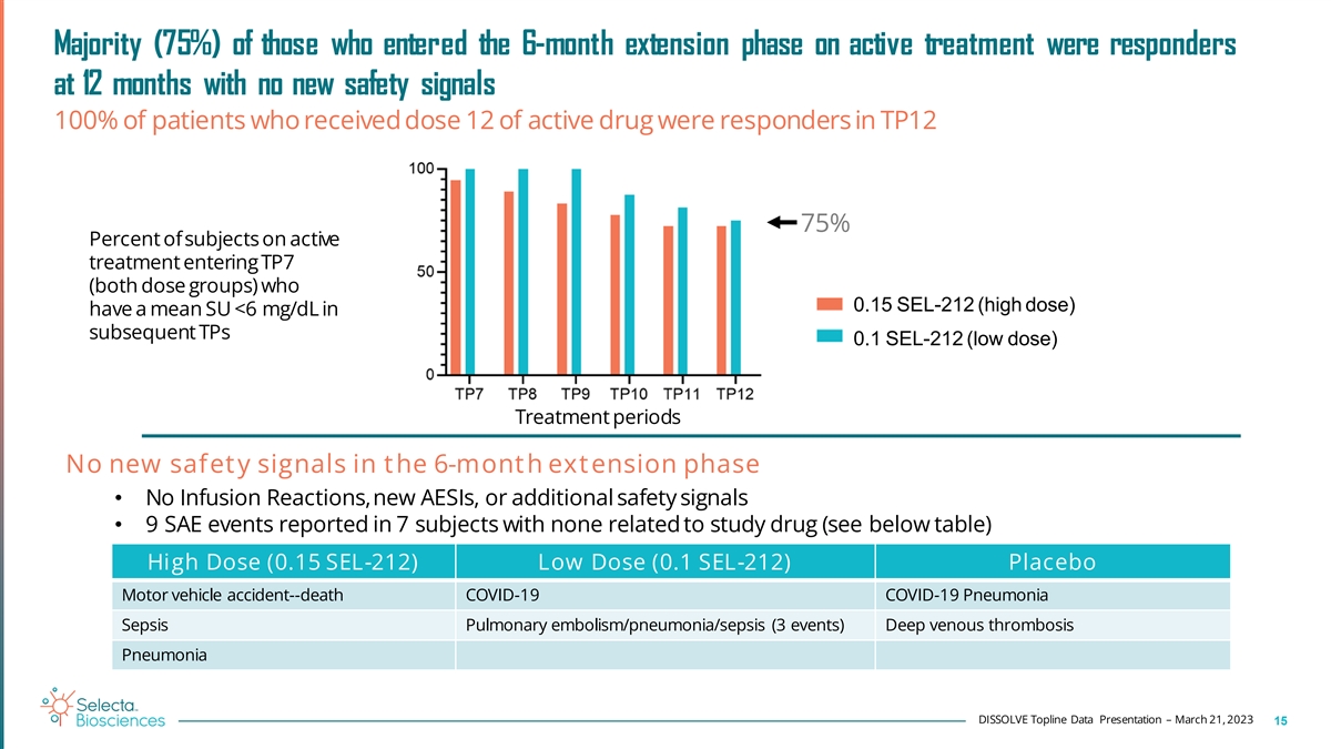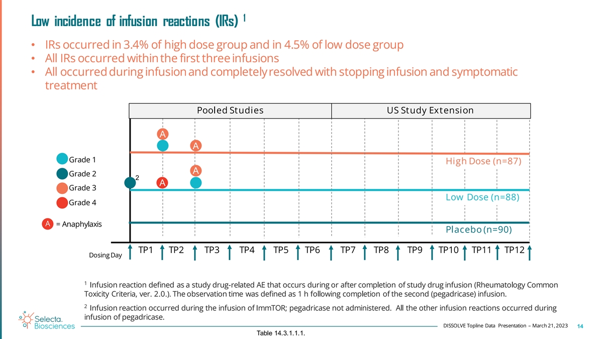 1 Low incidence of infusion reactions (IRs) • IRs occurred in 3.4% of high dose group and in 4.5% of low dose group • All IRs occurred within the first three infusions • All occurred during infusion and completely resolved with stopping infusion and symptomatic treatment Pooled St udies US Study Extension A A Grade 1 High Dose (n=87) A Grade 2 2 A Grade 3 Low Dose (n=88) Grade 4 A = Anaphylaxis Placebo (n=90) TP1 TP2 TP3 TP4 TP5 TP6 TP7 TP8 TP9 TP10 TP11 TP12 Dosing Day 1 Infusion reaction defined as a study drug-related AE that occurs during or after completion of study drug infusion (Rheumatology Common Toxicity Criteria, ver. 2.0.). The observation time was defined as 1 h following completion of the second (pegadricase) infusion. 2 Infusion reaction occurred during the infusion of ImmTOR; pegadricase not administered. All the other infusion reactions occurred during infusion of pegadricase. DISSOLVE Topline Data Presentation – March 21, 2023 14 Table 14.3.1.1.1.