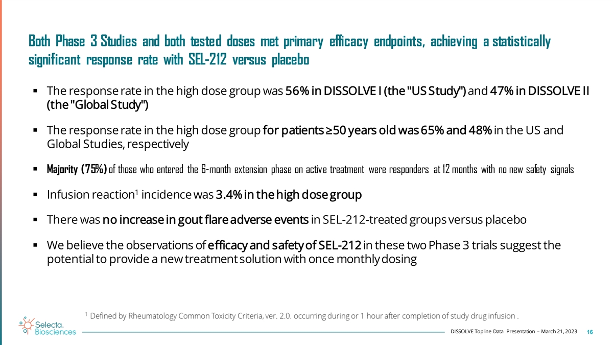 Majority (75%) of those who entered the 6-month extension phase on active treatment were responders at 12 months with no new safety signals 100% of patients who received dose 12 of active drug were responders in TP12 75% Percent of subjects on active treatment entering TP7 (both dose groups) who 0.15 SEL-212 (high dose) have a mean SU <6 mg/dL in subsequent TPs 0.1 SEL-212 (low dose) Treatment periods No new safet y signals in t he 6-mont h ext ension phase • No Infusion Reactions, new AESIs, or additional safety signals • 9 SAE events reported in 7 subjects with none related to study drug (see below table) High Dose (0.15 SEL-212) Low Dose (0.1 SEL-212) Placebo Motor vehicle accident--death COVID-19 COVID-19 Pneumonia Sepsis Pulmonary embolism/pneumonia/sepsis (3 events) Deep venous thrombosis Pneumonia DISSOLVE Topline Data Presentation – March 21, 2023 15