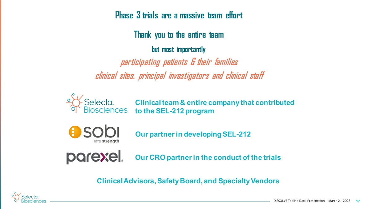 Both Phase 3 Studies and both tested doses met primary efficacy endpoints, achieving a statistically significant response rate with SEL-212 versus placebo § The response rate in the high dose group was 56% in DISSOLVE I (the US Study ) and 47% in DISSOLVE II (the Global Study ) § The response rate in the high dose group for patients ≥50 years old was 65% and 48% in the US and Global Studies, respectively § Majority (75%) of those who entered the 6-month extension phase on active treatment were responders at 12 months with no new safety signals 1 § Infusion reaction incidence was 3.4% in the high dose group § There was no increase in gout flare adverse events in SEL-212-treated groups versus placebo § We believe the observations of efficacy and safety of SEL-212 in these two Phase 3 trials suggest the potential to provide a new treatment solution with once monthly dosing DISSOLVE Topline Data Presentation – March 21, 2023 16