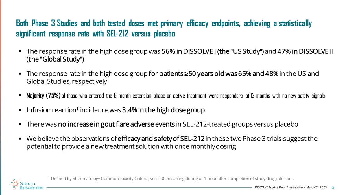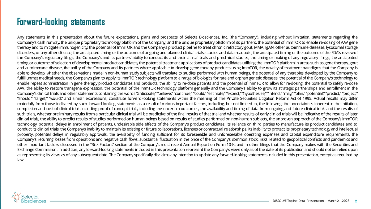 Forward-looking statements Any statements in this presentation about the future expectations, plans and prospects of Selecta Biosciences, Inc. (the “Company”), including without limitation, statements regarding the Company’s cash runway, the unique proprietary technology platform of the Company, and the unique proprietary platform of its partners, the potential of ImmTOR to enable re-dosing of AAV gene therapy and to mitigate immunogenicity, the potential of ImmTOR and the Company’s product pipeline to treat chronic refractory gout, MMA, IgAN, other autoimmune diseases, lysosomal storage disorders, or anyother disease, the anticipated timing or theoutcome ofongoing and planned clinical trials, studies and data readouts, the anticipated timing or the outcome of the FDA’s reviewof the Company’s regulatory filings, the Company’s and its partners’ ability to conduct its and their clinical trials and preclinical studies, the timing or making of any regulatory filings, the anticipated timing or outcome of selection of developmental product candidates, the potential treatment applications of product candidates utilizing the ImmTOR platform in areas such as gene therapy, gout and autoimmune disease, the ability of the Company and its partners where applicable to develop gene therapy products using ImmTOR, the novelty of treatment paradigms that the Company is able to develop, whether the observations made in non-human study subjects will translate to studies performed with human beings, the potential of any therapies developed by the Company to fulfill unmet medical needs, the Company’s plan to apply its ImmTOR technology platform to a range of biologics for rare and orphan genetic diseases, the potential of the Company’s technology to enable repeat administration in gene therapy product candidates and products, the ability to re-dose patients and the potential of ImmTOR to allow for re-dosing, the potential to safely re-dose AAV, the ability to restore transgene expression, the potential of the ImmTOR technology platform generally and the Company’s ability to grow its strategic partnerships and enrollment in the Company's clinical trials and other statements containing the words “anticipate,” “believe,” “continue,” “could,” “estimate,” “expect,” “hypothesize,” “intend,” “may,” “plan,” “potential,” “predict,” “project,” “should,” “target,” “would,” and similar expressions, constitute forward-looking statements within the meaning of The Private Securities Litigation Reform Act of 1995. Actual results may differ materially from those indicated by such forward-looking statements as a result of various important factors, including, but not limited to, the following: the uncertainties inherent in the initiation, completion and cost of clinical trials including proof of concept trials, including the uncertain outcomes, the availability and timing of data from ongoing and future clinical trials and the results of such trials, whether preliminary results from a particular clinical trial will be predictive of the final results of that trial and whether results of early clinical trials will be indicative of the results of later clinical trials, the ability to predict results of studies performed on human beings based on results of studies performed on non-human subjects, the unproven approach of the Company’s ImmTOR technology, potential delays in enrollment of patients, undesirable side effects of the Company’s product candidates, its reliance on third parties to manufacture its product candidates and to conduct its clinical trials, the Company’s inability to maintain its existing or future collaborations, licenses or contractual relationships, its inability to protect its proprietary technology and intellectual property, potential delays in regulatory approvals, the availability of funding sufficient for its foreseeable and unforeseeable operating expenses and capital expenditure requirements, the Company’s recurring losses from operations and negative cash flows, substantial fluctuation in the price of the Company’s common stock, risks related to geopolitical conflicts and pandemics and other important factors discussed in the “Risk Factors” section of the Company’s most recent Annual Report on Form 10-K, and in other filings that the Company makes with the Securities and Exchange Commission. In addition, any forward-looking statements included in this presentation represent the Company’s views only as of the date of its publication and should notbe relied upon as representing its views as of any subsequent date. The Company specifically disclaims any intention to update any forward-looking statements included in this presentation, except as required by law. DISSOLVE Topline Data Presentation – March 21, 2023 2