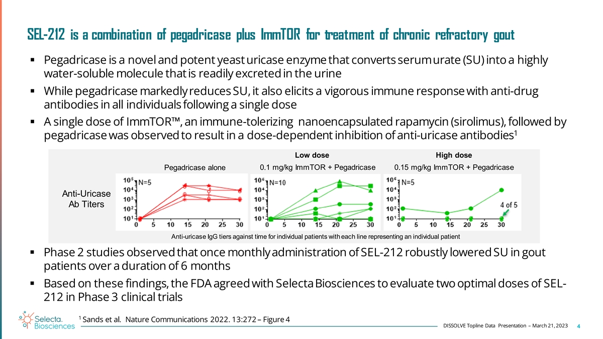 Both Phase 3 Studies and both tested doses met primary efficacy endpoints, achieving a statistically significant response rate with SEL-212 versus placebo § The response rate in the high dose group was 56% in DISSOLVE I (the US Study ) and 47% in DISSOLVE II (the Global Study ) § The response rate in the high dose group for patients ≥50 years old was 65% and 48% in the US and Global Studies, respectively § Majority (75%) of those who entered the 6-month extension phase on active treatment were responders at 12 months with no new safety signals 1 § Infusion reaction incidence was 3.4% in the high dose group § There was no increase in gout flare adverse events in SEL-212-treated groups versus placebo § We believe the observations of efficacy and safety of SEL-212 in these two Phase 3 trials suggest the potential to provide a new treatment solution with once monthly dosing DISSOLVE Topline Data Presentation – March 21, 2023 3