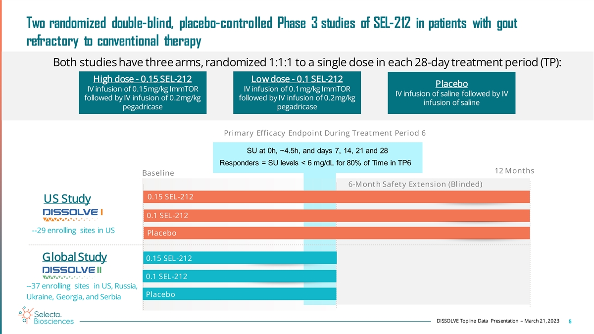 SEL-212 is a combination of pegadricase plus ImmTOR for treatment of chronic refractory gout § Pegadricase is a novel and potent yeast uricase enzyme that converts serum urate (SU) into a highly water-soluble molecule that is readily excreted in the urine § While pegadricase markedly reduces SU, it also elicits a vigorous immune response with anti-drug antibodies in all individuals following a single dose § A single dose of ImmTOR™, an immune-tolerizing nanoencapsulated rapamycin (sirolimus), followed by 1 pegadricase was observed to result in a dose-dependent inhibition of anti-uricase antibodies Low dose High dose Pegadricase alone 0.1 mg/kg ImmTOR + Pegadricase 0.15 mg/kg ImmTOR + Pegadricase Anti-Uricase Ab Titers Anti-uricase IgG tiers against time for individual patients with each line representing an individual patient § Phase 2 studies observed that once monthly administration of SEL-212 robustly lowered SU in gout patients over a duration of 6 months § Based on these findings, the FDA agreed with Selecta Biosciences to evaluate two optimal doses of SEL- 212 in Phase 3 clinical trials 1 Sands et al. Nature Communications 2022. 13:272 – Figure 4 DISSOLVE Topline Data Presentation – March 21, 2023 4
