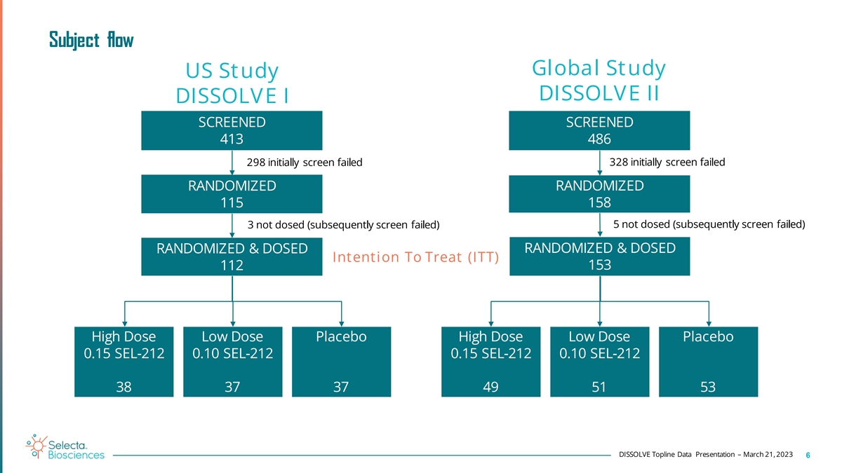 Two randomized double-blind, placebo-controlled Phase 3 studies of SEL-212 in patients with gout refractory to conventional therapy Both studies have three arms, randomized 1:1:1 to a single dose in each 2 -d 8 ay treatment period (TP): High dose - 0.15 SEL-212 Low dose - 0.1 SEL-212 Placebo IV infusion of 0.15mg/kg ImmTOR IV infusion of 0.1mg/kg ImmTOR IV infusion of saline followed by IV followed by IV infusion of 0.2mg/kg followed by IV infusion of 0.2mg/kg infusion of saline pegadricase pegadricase Primary Efficacy Endpoint During Treatment Period 6 SU at 0h, ~4.5h, and days 7, 14, 21 and 28 Responders = SU levels < 6 mg/dL for 80% of Time in TP6 12 M ont hs Baseline 6-Month Safety Extension (Blinded) 0.15 SEL-212 US Study 0.1 SEL-212 --29 enrolling sites in US Placebo Global Study 0.15 SEL-212 0.1 SEL-212 --37 enrolling sites in US, Russia, Placebo Ukraine, Georgia, and Serbia DISSOLVE Topline Data Presentation – March 21, 2023 5