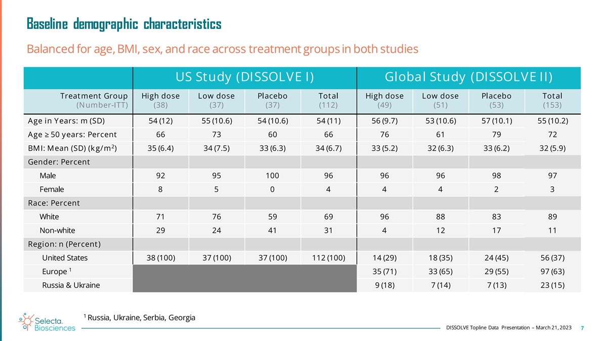 Subject flow Global Study US Study DISSOLVE II DISSOLVE I SCREENED SCREENED 413 486 328 initially screen failed 298 initially screen failed RANDOMIZED RANDOMIZED 115 158 5 not dosed (subsequently screen failed) 3 not dosed (subsequently screen failed) RANDOMIZED & DOSED RANDOMIZED & DOSED Intention To Treat (ITT) 153 112 High Dose Low Dose Placebo High Dose Low Dose Placebo 0.15 SEL-212 0.10 SEL-212 0.15 SEL-212 0.10 SEL-212 38 37 37 49 51 53 DISSOLVE Topline Data Presentation – March 21, 2023 6