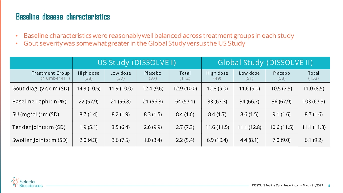 Baseline demographic characteristics Balanced for age, BMI, sex, and race across treatment groups in both studies US Study (DISSOLVE I) Global Study (DISSOLVE II) Treatment Group High dose Low dose Placebo Total High dose Low dose Placebo Total (Number-ITT) (38) (37) (37) (112) (49) (51) (53) (153) Age in Years: m (SD) 54 (12) 55 (10.6) 54 (10.6) 54 (11) 56 (9.7) 53 (10.6) 57 (10.1) 55 (10.2) Age ≥ 50 years: Percent 66 73 60 66 76 61 79 72 2 BMI: Mean (SD) (k g/m ) 35 (6.4) 34 (7.5) 33 (6.3) 34 (6.7) 33 (5.2) 32 (6.3) 33 (6.2) 32 (5.9) Gender: Percent Male 92 95 100 96 96 96 98 97 Female 8 5 0 4 4 4 2 3 Race: Percent White 71 76 59 69 96 88 83 89 Non-white 29 24 41 31 4 12 17 11 Region: n (Percent) United States 38 (100) 37 (100) 37 (100) 112 (100) 14 (29) 18 (35) 24 (45) 56 (37) 1 Europe 35 (71) 33 (65) 29 (55) 97 (63) Russia & Ukraine 9 (18) 7 (14) 7 (13) 23 (15) 1 Russia, Ukraine, Serbia, Georgia DISSOLVE Topline Data Presentation – March 21, 2023 7