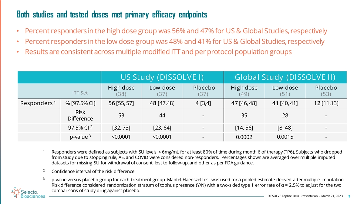 Baseline disease characteristics • Baseline characteristics were reasonably well balanced across treatment groups in each study • Gout severity was somewhat greater in the Global Study versus the US Study US Study (DISSOLVE I) Global Study (DISSOLVE II) Treatment Group High dose Low dose Placebo Total High dose Low dose Placebo Total (Number-ITT) (38) (37) (37) (112) (49) (51) (53) (153) Gout diag. (yr.): m (SD) 14.3 (10.5) 11.9 (10.0) 12.4 (9.6) 12.9 (10.0) 10.8 (9.0) 11.6 (9.0) 10.5 (7.5) 11.0 (8.5) Baseline Tophi : n (% ) 22 (57.9) 21 (56.8) 21 (56.8) 64 (57.1) 33 (67.3) 34 (66.7) 36 (67.9) 103 (67.3) SU (mg/dL): m (SD) 8.7 (1.4) 8.2 (1.9) 8.3 (1.5) 8.4 (1.6) 8.4 (1.7) 8.6 (1.5) 9.1 (1.6) 8.7 (1.6) Tender Joints: m (SD) 1.9 (5.1) 3.5 (6.4) 2.6 (9.9) 2.7 (7.3) 11.6 (11.5) 11.1 (12.8) 10.6 (11.5) 11.1 (11.8) Sw ollen Joint s: m (SD) 2.0 (4.3) 3.6 (7.5) 1.0 (3.4) 2.2 (5.4) 6.9 (10.4) 4.4 (8.1) 7.0 (9.0) 6.1 (9.2) DISSOLVE Topline Data Presentation – March 21, 2023 8
