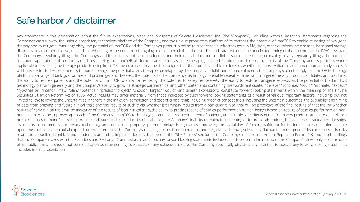 2Selecta Biosciences Investor Presentation – January 2023 Any statements in this presentation about the future expectations, plans and prospects of Selecta Biosciences, Inc. (the “Company”), including without limitation, statements regarding the Company’s cash runway, the unique proprietary technology platform of the Company, and the unique proprietary platform of its partners, the potential of ImmTOR to enable re-dosing of AAV gene therapy and to mitigate immunogenicity, the potential of ImmTOR and the Company’s product pipeline to treat chronic refractory gout, MMA, IgAN, other autoimmune diseases, lysosomal storage disorders, or any other disease, the anticipated timing or the outcome of ongoing and planned clinical trials, studies and data readouts, the anticipated timing or the outcome of the FDA’s review of the Company’s regulatory filings, the Company’s and its partners’ ability to conduct its and their clinical trials and preclinical studies, the timing or making of any regulatory filings, the potential treatment applications of product candidates utilizing the ImmTOR platform in areas such as gene therapy, gout and autoimmune disease, the ability of the Company and its partners where applicable to develop gene therapy products using ImmTOR, the novelty of treatment paradigms that the Company is able to develop, whether the observations made in non-human study subjects will translate to studies performed with human beings, the potential of any therapies developed by the Company to fulfill unmet medical needs, the Company’s plan to apply its ImmTOR technology platform to a range of biologics for rare and orphan genetic diseases, the potential of the Company’s technology to enable repeat administration in gene therapy product candidates and products, the ability to re-dose patients and the potential of ImmTOR to allow for re-dosing, the potential to safely re-dose AAV, the ability to restore transgene expression, the potential of the ImmTOR technology platform generally and the Company’s ability to grow its strategic partnerships, and other statements containing the words “anticipate,” “believe,” “continue,” “could,” “estimate,” “expect,” “hypothesize,” “intend,” “may,” “plan,” “potential,” “predict,” “project,” “should,” “target,” “would,” and similar expressions, constitute forward-looking statements within the meaning of The Private Securities Litigation Reform Act of 1995. Actual results may differ materially from those indicated by such forward-looking statements as a result of various important factors, including, but not limited to, the following: the uncertainties inherent in the initiation, completion and cost of clinical trials including proof of concept trials, including the uncertain outcomes, the availability and timing of data from ongoing and future clinical trials and the results of such trials, whether preliminary results from a particular clinical trial will be predictive of the final results of that trial or whether results of early clinical trials will be indicative of the results of later clinical trials, the ability to predict results of studies performed on human beings based on results of studies performed on non- human subjects, the unproven approach of the Company’s ImmTOR technology, potential delays in enrollment of patients, undesirable side effects of the Company’s product candidates, its reliance on third parties to manufacture its product candidates and to conduct its clinical trials, the Company’s inability to maintain its existing or future collaborations, licenses or contractual relationships, its inability to protect its proprietary technology and intellectual property, potential delays in regulatory approvals, the availability of funding sufficient for its foreseeable and unforeseeable operating expenses and capital expenditure requirements, the Company’s recurring losses from operations and negative cash flows, substantial fluctuation in the price of its common stock, risks related to geopolitical conflicts and pandemics and other important factors discussed in the “Risk Factors” section of the Company’s most recent Annual Report on Form 10-K, and in other filings that the Company makes with the Securities and Exchange Commission. In addition, any forward-looking statements included in this presentation represent the Company’s views only as of the date of its publication and should not be relied upon as representing its views as of any subsequent date. The Company specifically disclaims any intention to update any forward-looking statements included in this presentation. Safe harbor / disclaimer