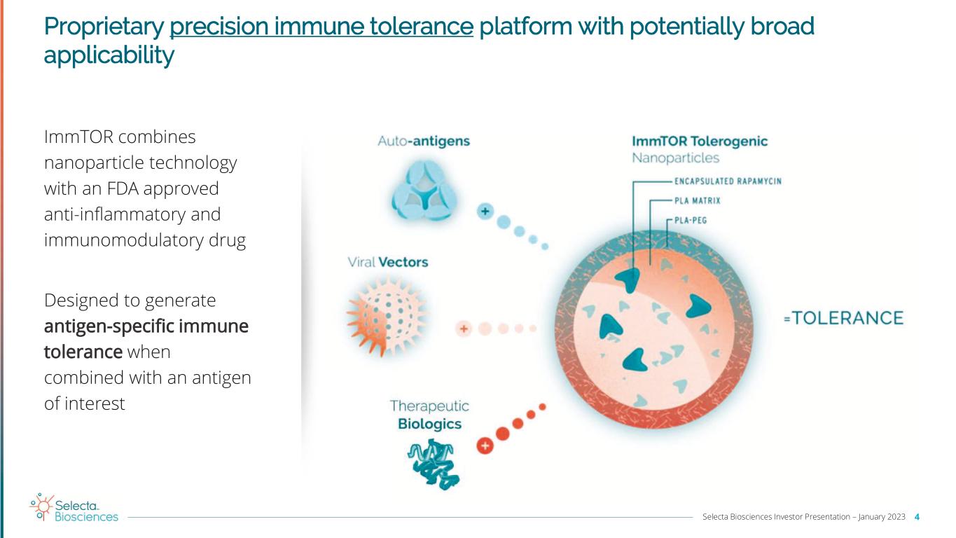 3Selecta Biosciences Investor Presentation – January 2023 Diversified pipeline of novel therapeutic candidates; proof of concept in biologics and gene therapy, expanding into autoimmune disease 1 2 3 4 Strong balance sheet, positioned to reach multiple value inflection points with expected runway into mid-2024 5 ImmTOR® and ImmTOR-IL™ immune tolerance platforms have potentially broad applicability to address the challenges of autoimmunity and immunogenicity Topline Phase 3 data for SEL-212 in chronic refractory gout expected in Q1 2023, with additional value-generating milestones anticipated in 2023 Multiple strategic partnerships designed to validate platform and maximize its potential