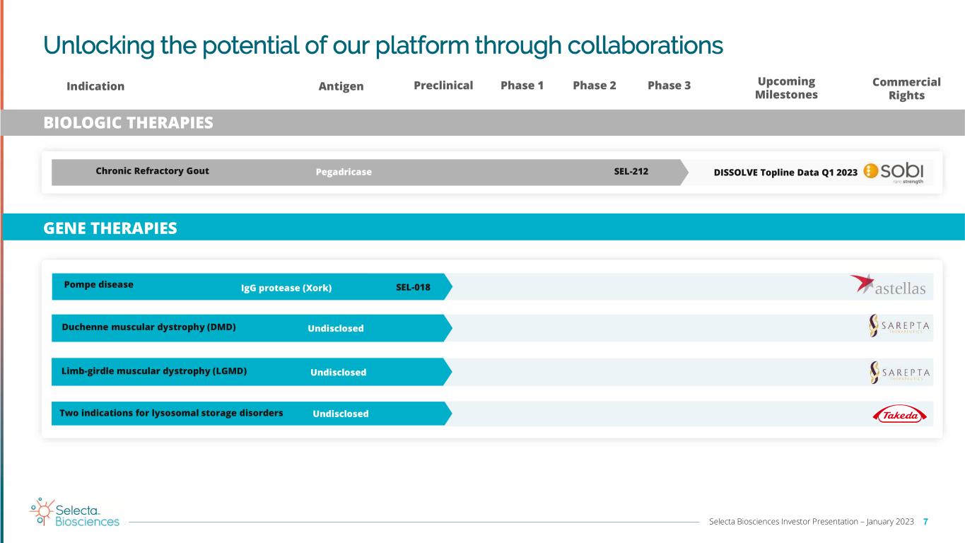 6Selecta Biosciences Investor Presentation – January 2023 A diversified and growing wholly-owned pipeline Recent and Expected Upcoming MilestonesIndication Antigen Preclinical Phase 1 Phase 3Phase 2 TOLEROGENIC THERAPIES Primary biliary cholangitis (PBC) PDC-E2 Undisclosed c GENE THERAPIES Phase 1 start Q4 2022Methylmalonic acidemia (MMA) AAV (serotype undisclosed) SEL-302 BIOLOGIC THERAPIES IgA protease IgA nephropathy (IgAN) IgA1 protease* *Option & License Agreement with IGAN Biosciences