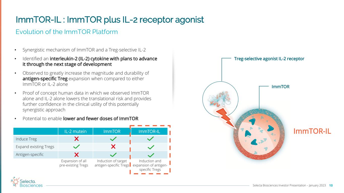 9Selecta Biosciences Investor Presentation – January 2023 Striving to restore self-tolerance in autoimmune diseases ImmTOR + IL-2 has the potential to be a best-in-class approach Approach: restore natural self-tolerance by administering ImmTOR with nanoparticle-encapsulated self-antigens and avoid the need for chronic and systemic immune suppression Aiming to expand antigen-specific Tregs and enhance durability of tolerance by developing a proprietary Treg- selective IL-2 to combine with ImmTOR and autoantigens cTHE Solution Roughly 80 autoimmune conditions affect as much as 4.5% of the world’s population*; 24M+ individuals in the US alone are affected by autoimmune diseases** The current standard of care is broad immunosuppression, which is associated with side effects and leaves patients vulnerable to serious infection and malignancies There is a significant need for antigen-specific therapies that can induce immune tolerance to pathogenic autoantigens without the need for chronic and systemic immune suppression cTHE Challenges *Autoimmune Disease, by the Numbers" in Scientific American 325, 3, 31-33 (September 2021), doi:10.1038/scientificamerican0921-31 **https://www.niehs.nih.gov/health/topics/conditions/autoimmune/index.cfm