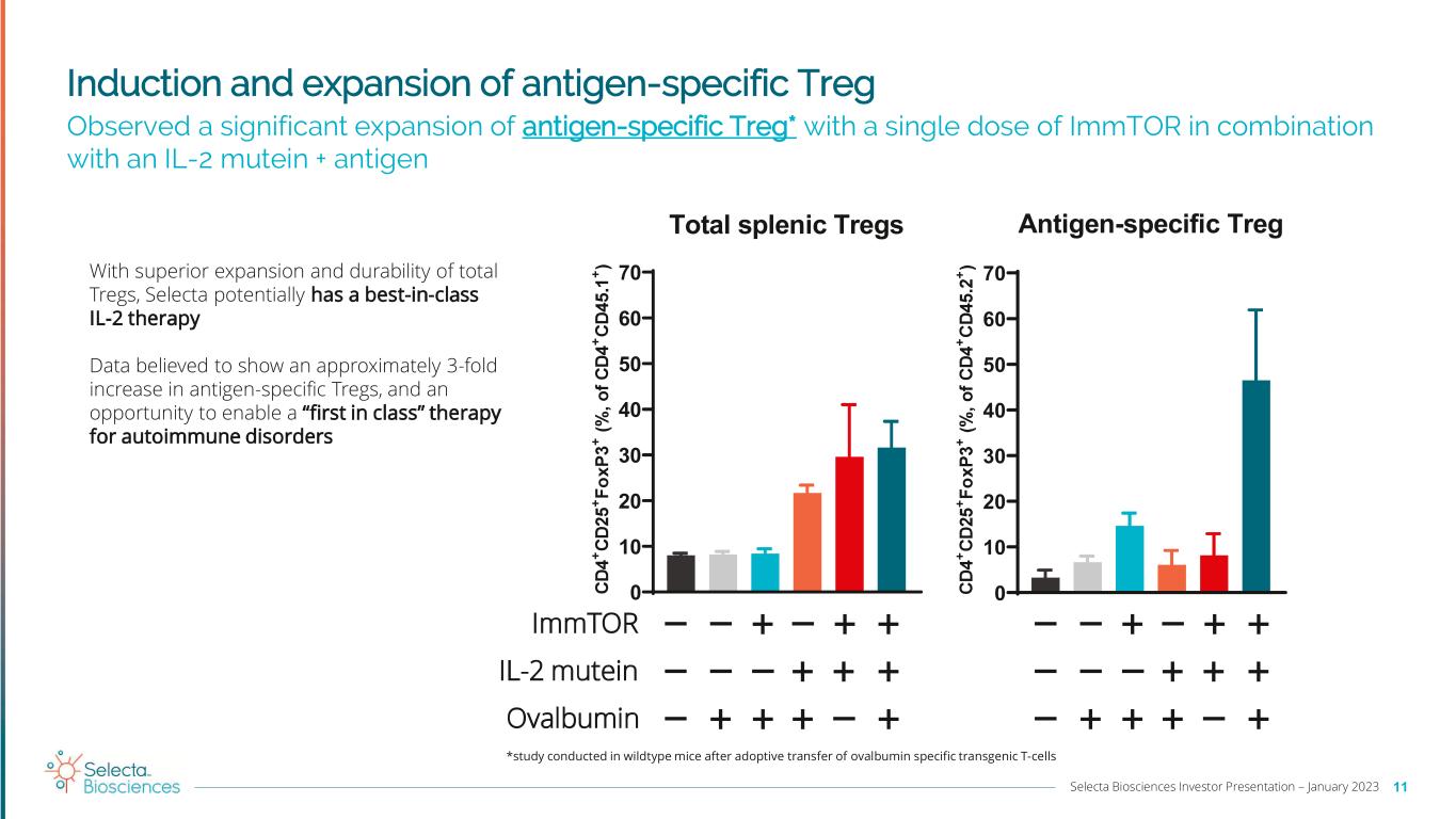 10Selecta Biosciences Investor Presentation – January 2023 ImmTOR-IL : ImmTOR plus IL-2 receptor agonist ImmTOR-IL Treg-selective agonist IL-2 receptor • Synergistic mechanism of ImmTOR and a Treg-selective IL-2 • Identified an interleukin-2 (IL-2) cytokine with plans to advance it through the next stage of development • Observed to greatly increase the magnitude and durability of antigen-specific Treg expansion when compared to either ImmTOR or IL-2 alone • Proof of concept human data in which we observed ImmTOR alone and IL-2 alone lowers the translational risk and provides further confidence in the clinical utility of this potentially synergistic approach • Potential to enable lower and fewer doses of ImmTOR Evolution of the ImmTOR Platform ImmTOR IL-2 mutein ImmTOR ImmTOR-IL Induce Treg Expand existing Tregs Antigen-specific Expansion of all pre-existing Tregs Induction of target antigen-specific Tregs Induction and expansion of antigen- specific Tregs