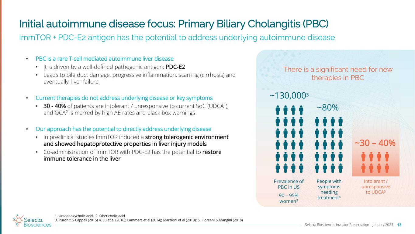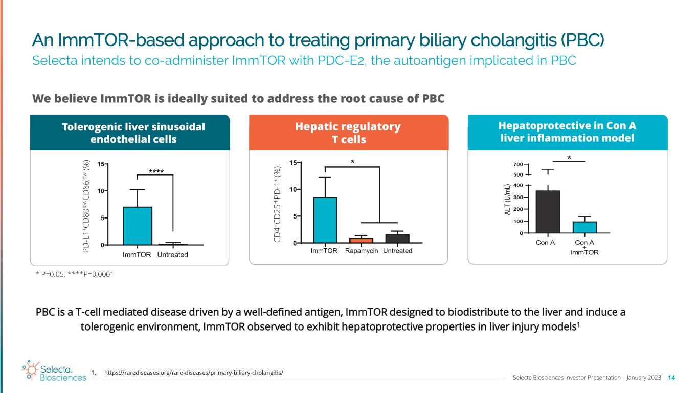 13Selecta Biosciences Investor Presentation – January 2023 Initial autoimmune disease focus: Primary Biliary Cholangitis (PBC) ImmTOR + PDC-E2 antigen has the potential to address underlying autoimmune disease 1. Ursodeoxycholic acid, 2. Obeticholic acid 3. Purohit & Cappell (2015) 4. Lu et al (2018); Lammers et al (2014); Marzioni et al (2019); 5. Floreani & Mangini (2018) • PBC is a rare T-cell mediated autoimmune liver disease • It is driven by a well-defined pathogenic antigen: PDC-E2 • Leads to bile duct damage, progressive inflammation, scarring (cirrhosis) and • Current therapies do not address underlying disease or key symptoms • 30 - 40% of patients are intolerant / unresponsive to current SoC (UDCA1), and OCA2 is marred by high AE rates and black box warnings • Our approach has the potential to directly address underlying disease • In preclinical studies ImmTOR induced a strong tolerogenic environment and showed hepatoprotective properties in liver injury models • Co-administration of ImmTOR with PDC-E2 has the potential to restore immune tolerance in the liver ~130,0003 Prevalence of PBC in US 90 – 95% women3 ~80% People with symptoms needing treatment4 Intolerant / unresponsive to UDCA5 ~30 – 40% There is a significant need for new therapies in PBC