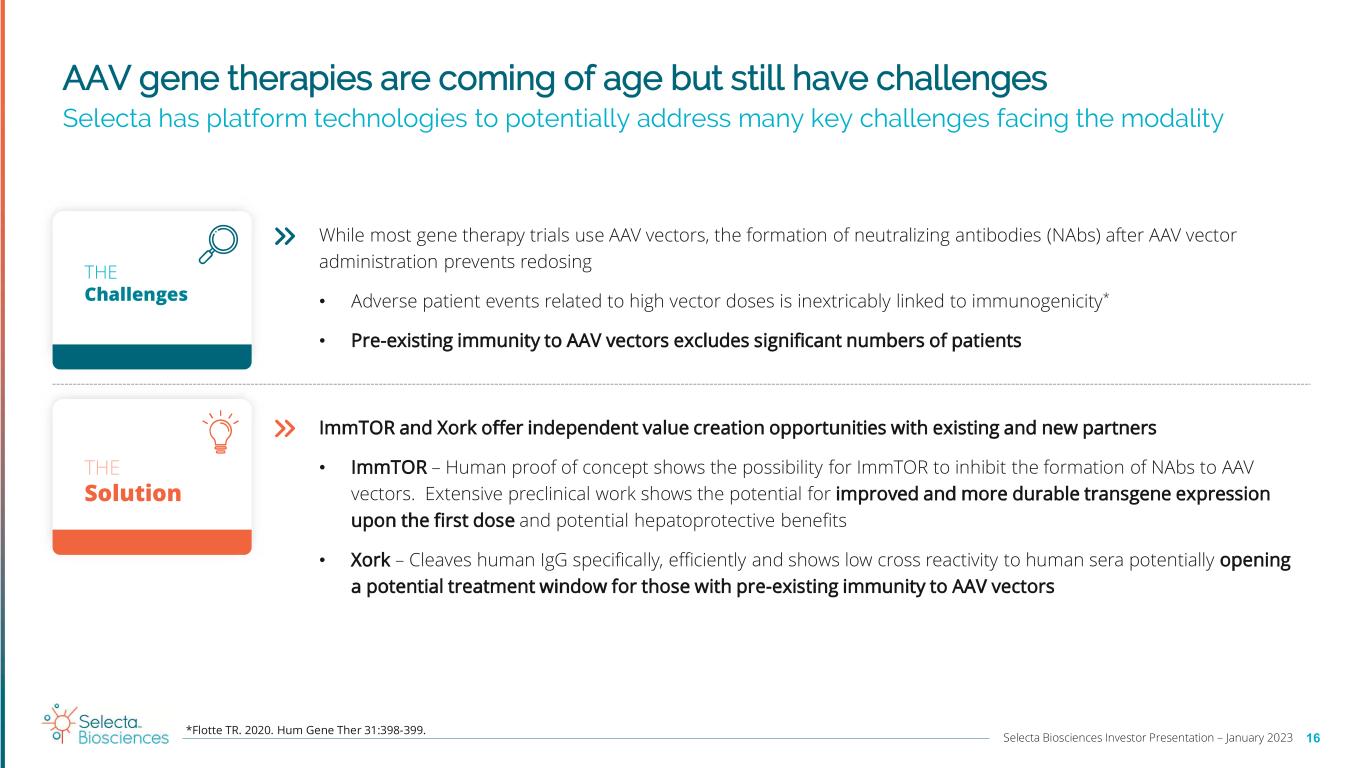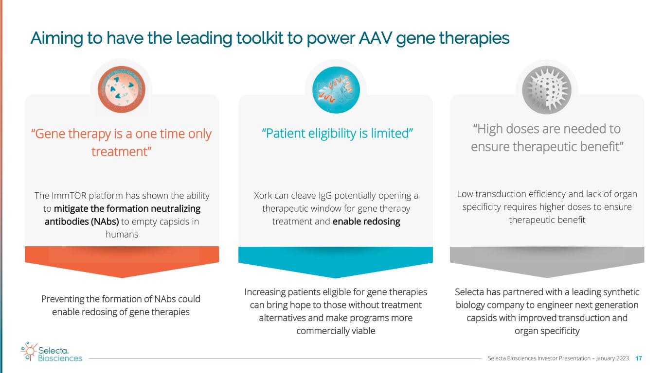 16Selecta Biosciences Investor Presentation – January 2023 AAV gene therapies are coming of age but still have challenges Selecta has platform technologies to potentially address many key challenges facing the modality ImmTOR and Xork offer independent value creation opportunities with existing and new partners • ImmTOR – Human proof of concept shows the possibility for ImmTOR to inhibit the formation of NAbs to AAV vectors. Extensive preclinical work shows the potential for improved and more durable transgene expression upon the first dose and potential hepatoprotective benefits • Xork – Cleaves human IgG specifically, efficiently and shows low cross reactivity to human sera potentially opening a potential treatment window for those with pre-existing immunity to AAV vectors *Flotte TR. 2020. Hum Gene Ther 31:398-399. cTHE Solution While most gene therapy trials use AAV vectors, the formation of neutralizing antibodies (NAbs) after AAV vector administration prevents redosing • Adverse patient events related to high vector doses is inextricably linked to immunogenicity* • Pre-existing immunity to AAV vectors excludes significant numbers of patients cTHE Challenges