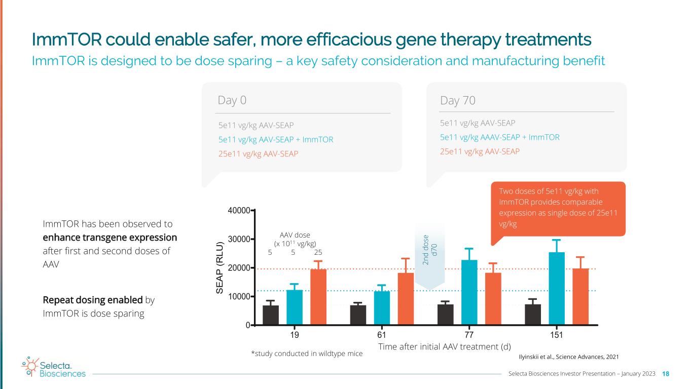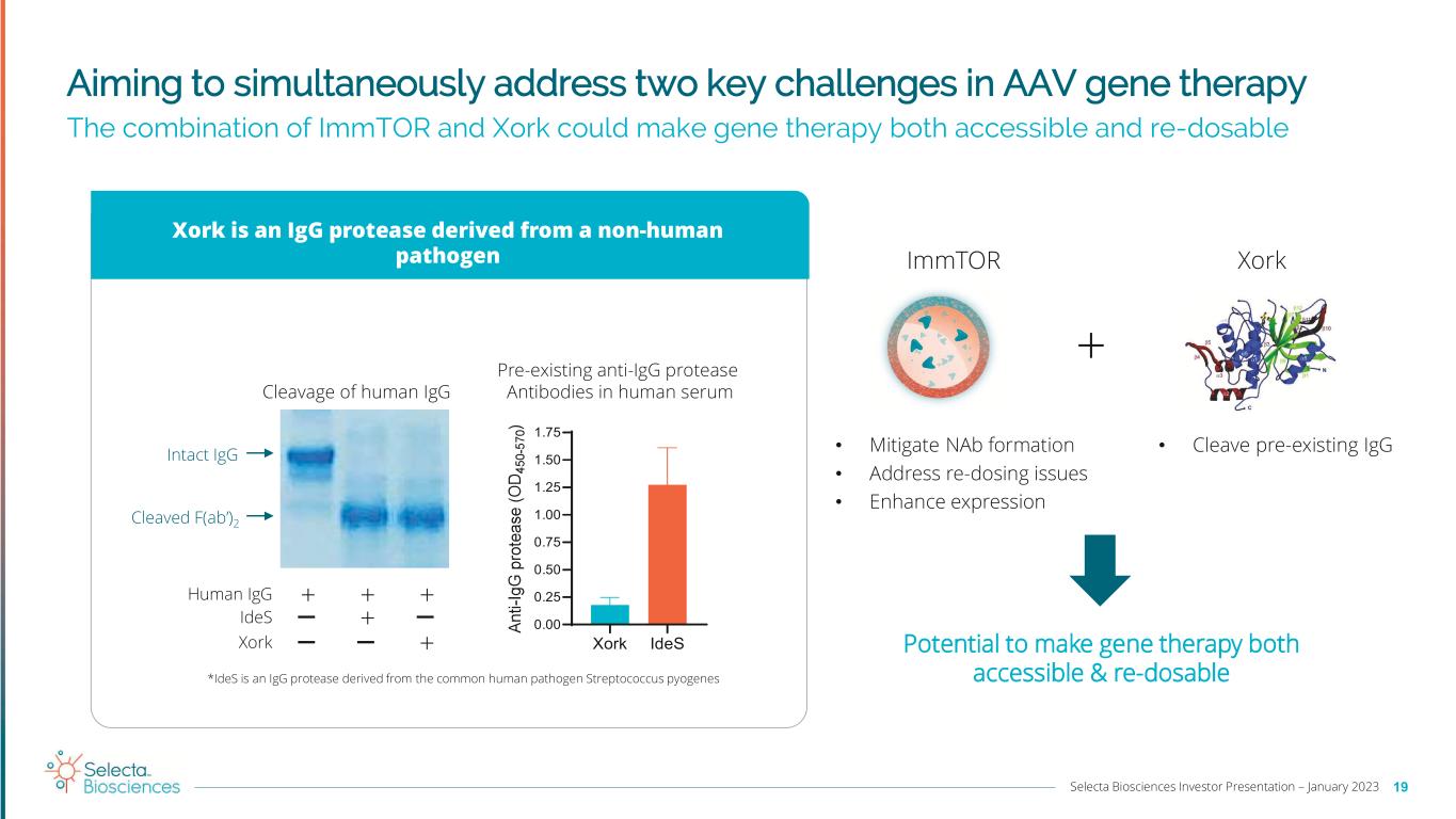 17Selecta Biosciences Investor Presentation – January 2023 Aiming to have the leading toolkit to power AAV gene therapies “High doses are needed to ensure therapeutic benefit” “Patient eligibility is limited”“Gene therapy is a one time only treatment” Low transduction efficiency and lack of organ specificity requires higher doses to ensure therapeutic benefit Xork can cleave IgG potentially opening a therapeutic window for gene therapy treatment and enable redosing The ImmTOR platform has shown the ability to mitigate the formation neutralizing antibodies (NAbs) to empty capsids in humans Selecta has partnered with a leading synthetic biology company to engineer next generation capsids with improved transduction and organ specificity Preventing the formation of NAbs could enable redosing of gene therapies Increasing patients eligible for gene therapies can bring hope to those without treatment alternatives and make programs more commercially viable