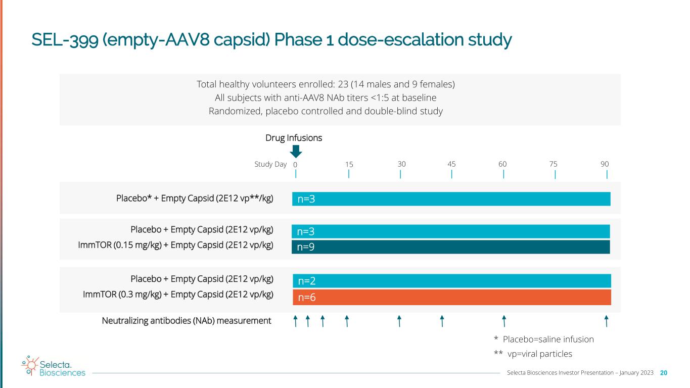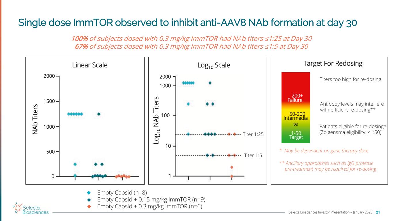 20Selecta Biosciences Investor Presentation – January 2023 SEL-399 (empty-AAV8 capsid) Phase 1 dose-escalation study Total healthy volunteers enrolled: 23 (14 males and 9 females) All subjects with anti-AAV8 NAb titers <1:5 at baseline Randomized, placebo controlled and double-blind study n=3 0 15 30 45 60 75 90 Placebo* + Empty Capsid (2E12 vp**/kg) Study Day Placebo + Empty Capsid (2E12 vp/kg) ImmTOR (0.15 mg/kg) + Empty Capsid (2E12 vp/kg) n=3 n=9 Placebo + Empty Capsid (2E12 vp/kg) ImmTOR (0.3 mg/kg) + Empty Capsid (2E12 vp/kg) n=2 n=6 Drug Infusions Neutralizing antibodies (NAb) measurement ** vp=viral particles * Placebo=saline infusion