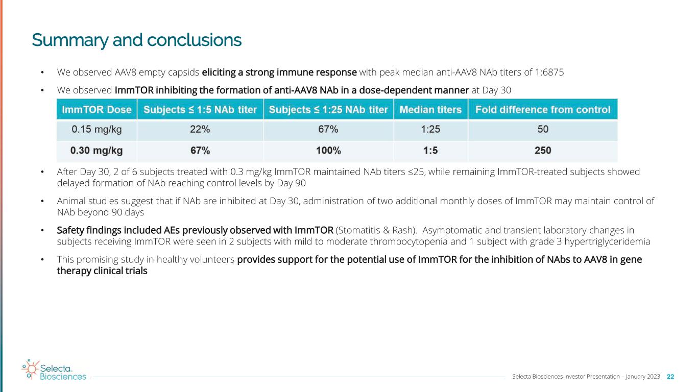 21Selecta Biosciences Investor Presentation – January 2023 Single dose ImmTOR observed to inhibit anti-AAV8 NAb formation at day 30 2000 1000 100 10 Titer 1:5 Titer 1:25 1 Log10 Scale 2000 1500 1000 500 0 Linear Scale Empty Capsid (n=8) Empty Capsid + 0.15 mg/kg ImmTOR (n=9) Empty Capsid + 0.3 mg/kg ImmTOR (n=6) Antibody levels may interfere with efficient re-dosing** Titers too high for re-dosing Patients eligible for re-dosing* * May be dependent on gene therapy dose ** Ancillary approaches such as IgG protease pre-treatment may be required for re-dosing 1-50 50-200 200+ Target Intermedia te Failure Target For Redosing