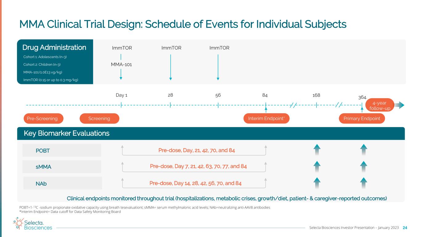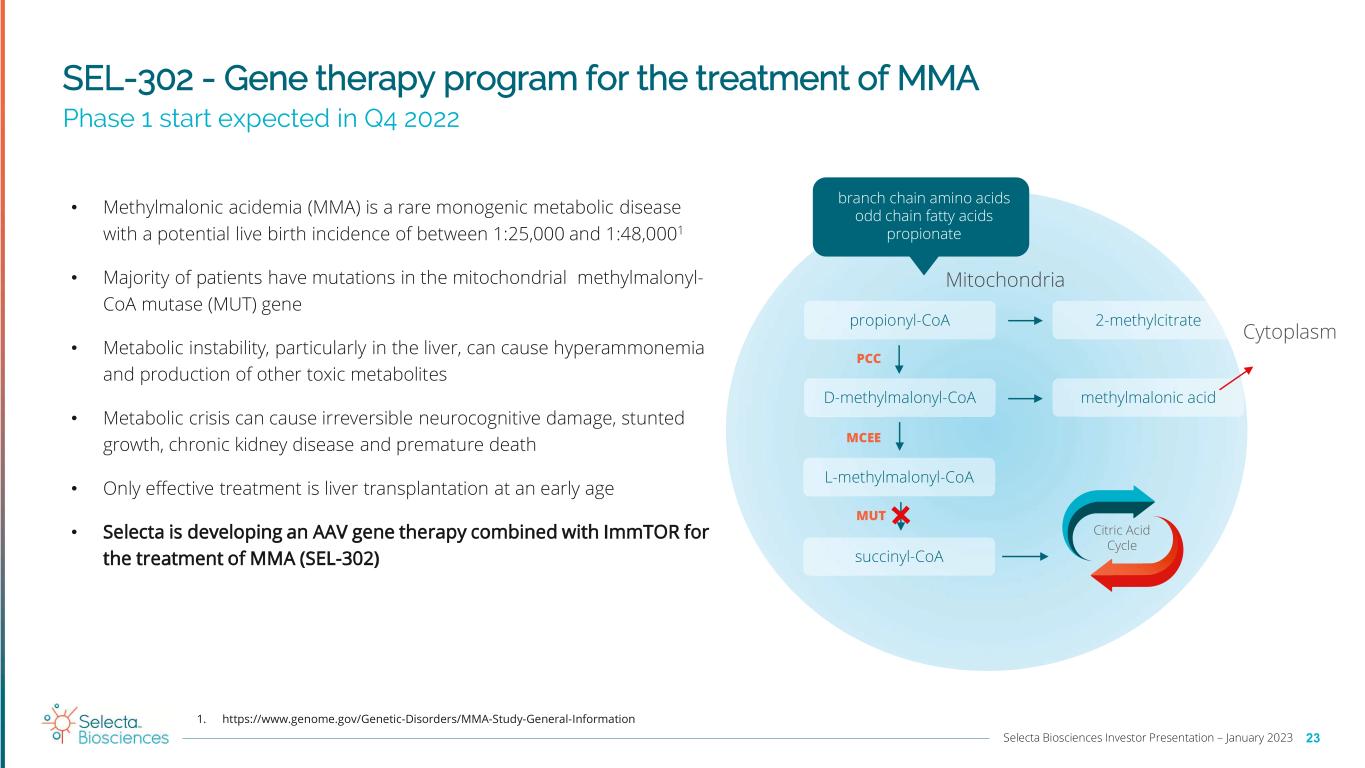 23Selecta Biosciences Investor Presentation – January 2023 SEL-302 - Gene therapy program for the treatment of MMA Phase 1 start expected in Q4 2022 • Methylmalonic acidemia (MMA) is a rare monogenic metabolic disease with a potential live birth incidence of between 1:25,000 and 1:48,0001 • Majority of patients have mutations in the mitochondrial methylmalonyl- CoA mutase (MUT) gene • Metabolic instability, particularly in the liver, can cause hyperammonemia and production of other toxic metabolites • Metabolic crisis can cause irreversible neurocognitive damage, stunted growth, chronic kidney disease and premature death • Only effective treatment is liver transplantation at an early age • Selecta is developing an AAV gene therapy combined with ImmTOR for the treatment of MMA (SEL-302) Mitochondria Cytoplasm branch chain amino acids odd chain fatty acids propionate propionyl-CoA D-methylmalonyl-CoA L-methylmalonyl-CoA succinyl-CoA PCC MCEE MUT Citric Acid Cycle 2-methylcitrate methylmalonic acid 1. https://www.genome.gov/Genetic-Disorders/MMA-Study-General-Information