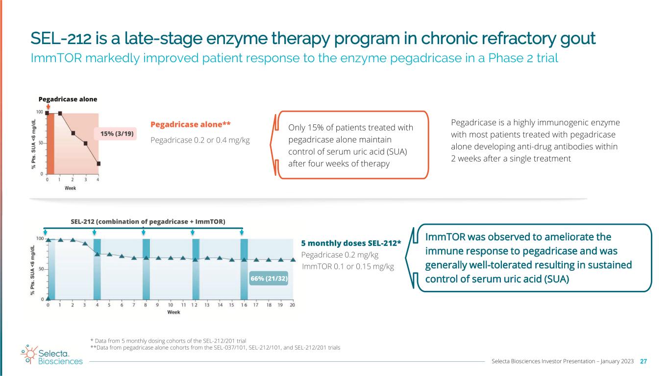 26Selecta Biosciences Investor Presentation – January 2023 cTHE Challenges Many biologics can be highly immunogenic resulting in suboptimal responses to the standard of care due to the development of anti-drug antibodies (ADAs) after multiple treatments Patients that develop an immune response to the current standard of care may be forced to discontinue treatment or experience adverse reactions ImmTOR designed to enhance biologic therapies Unlocking their full potential by potentially ameliorating unwanted immune responses ImmTOR, co-administered with immunogenic therapeutic enzymes, has the potential to ameliorate an immune response to the biologic treatment allowing patients to stay on therapy longer Extensive human data and significant safety database across multiple biologics demonstrates broad potential applicability and a promising approach to minimize the healthcare and economic burden of ADAs cTHE Solution Sands, E., Kivitz, A., DeHaan, W. et al. Tolerogenic nanoparticles mitigate the formation of anti-drug antibodies against pegylated uricase in patients with hyperuricemia. Nat Commun 13, 272 (2022). https://doi.org/10.1038/s41467-021-27945-7