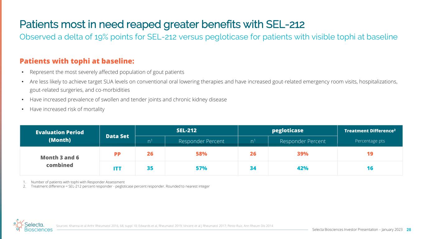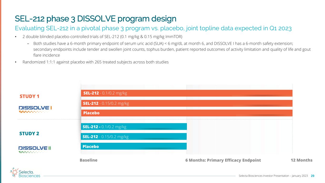28Selecta Biosciences Investor Presentation – January 2023 1. Number of patients with tophi with Responder Assessment 2. Treatment difference = SEL-212 percent responder - pegloticase percent responder. Rounded to nearest integer Evaluation Period (Month) Data Set SEL-212 pegloticase Treatment Difference2 Percentage ptsn1 Responder Percent n1 Responder Percent Month 3 and 6 combined PP 26 58% 26 39% 19 ITT 35 57% 34 42% 16 Patients with tophi at baseline: • Represent the most severely affected population of gout patients • Are less likely to achieve target SUA levels on conventional oral lowering therapies and have increased gout-related emergency room visits, hospitalizations, gout-related surgeries, and co-morbidities • Have increased prevalence of swollen and tender joints and chronic kidney disease • Have increased risk of mortality Sources: Khanna et al Arthr Rheumatol 2016, 68, suppl 10; Edwards et al, Rheumatol 2019; Vincent et al J Rheumatol 2017; Perez-Ruiz, Ann Rheum Dis 2014 Patients most in need reaped greater benefits with SEL-212 Observed a delta of 19% points for SEL-212 versus pegloticase for patients with visible tophi at baseline