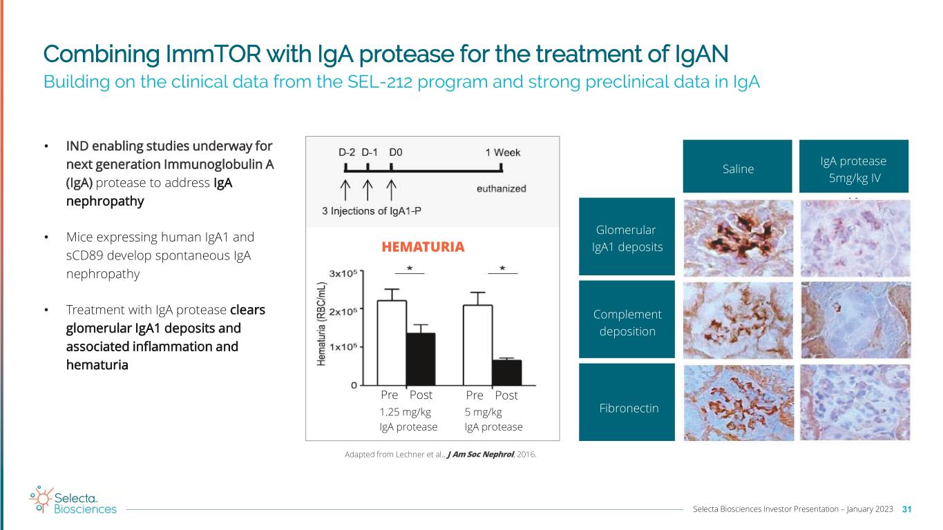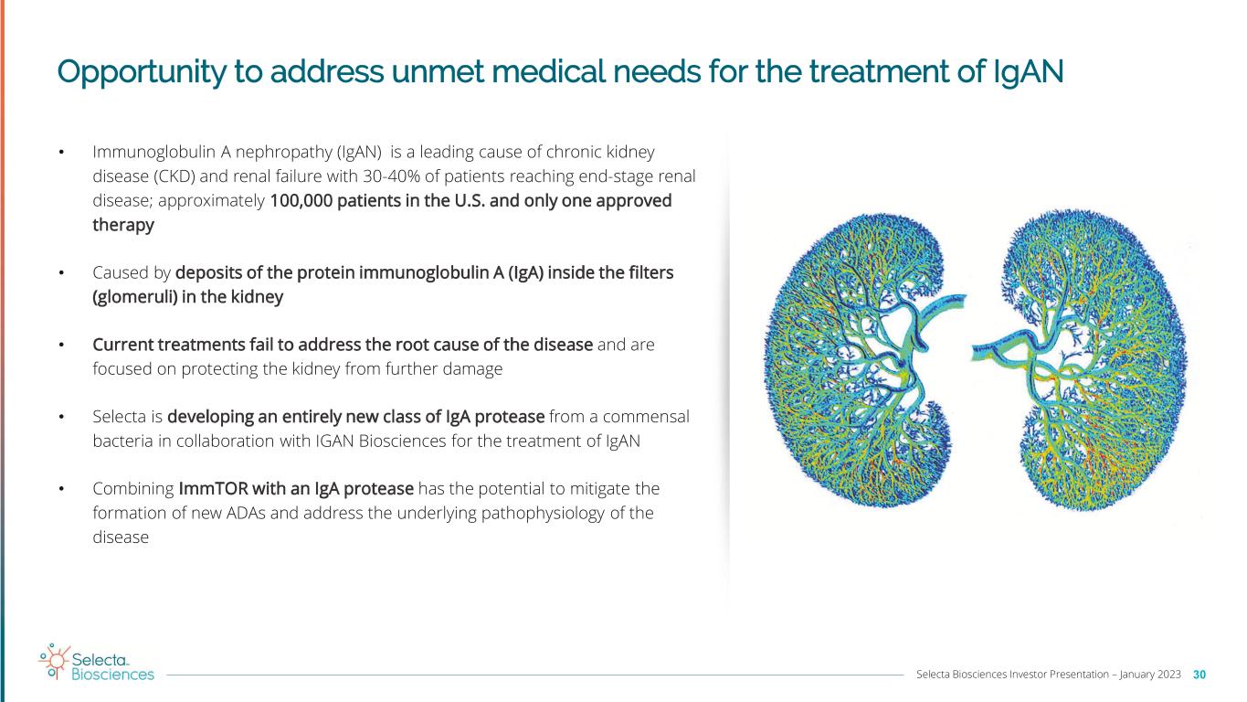 30Selecta Biosciences Investor Presentation – January 2023 Opportunity to address unmet medical needs for the treatment of IgAN • Immunoglobulin A nephropathy (IgAN) is a leading cause of chronic kidney disease (CKD) and renal failure with 30-40% of patients reaching end-stage renal disease; approximately 100,000 patients in the U.S. and only one approved therapy • Caused by deposits of the protein immunoglobulin A (IgA) inside the filters (glomeruli) in the kidney • Current treatments fail to address the root cause of the disease and are focused on protecting the kidney from further damage • Selecta is developing an entirely new class of IgA protease from a commensal bacteria in collaboration with IGAN Biosciences for the treatment of IgAN • Combining ImmTOR with an IgA protease has the potential to mitigate the formation of new ADAs and address the underlying pathophysiology of the disease