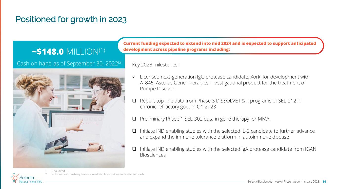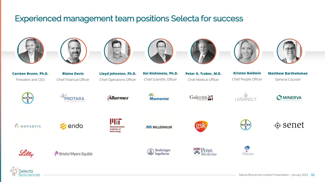 33Selecta Biosciences Investor Presentation – January 2023 Peter G. Traber, M.D. Chief Medical Officer Experienced management team positions Selecta for success Lloyd Johnston, Ph.D. Chief Operations Officer Carsten Brunn, Ph.D. President and CEO Kei Kishimoto, Ph.D. Chief Scientific Officer Kristen Baldwin Chief People Officer Blaine Davis Chief Financial Officer Matthew Bartholomae General Counsel