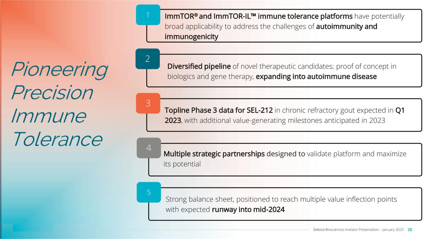 34Selecta Biosciences Investor Presentation – January 2023 1. Unaudited 2. Includes cash, cash equivalents, marketable securities and restricted cash. Key 2023 milestones: Licensed next-generation IgG protease candidate, Xork, for development with AT845, Astellas Gene Therapies’ investigational product for the treatment of Pompe Disease Report top-line data from Phase 3 DISSOLVE I & II programs of SEL-212 in chronic refractory gout in Q1 2023 Preliminary Phase 1 SEL-302 data in gene therapy for MMA Initiate IND enabling studies with the selected IL-2 candidate to further advance and expand the immune tolerance platform in autoimmune disease Initiate IND enabling studies with the selected IgA protease candidate from IGAN Biosciences Positioned for growth in 2023 ~$148.0 MILLION(1) Cash on hand as of September 30, 2022(2) Current funding expected to extend into mid 2024 and is expected to support anticipated development across pipeline programs including: