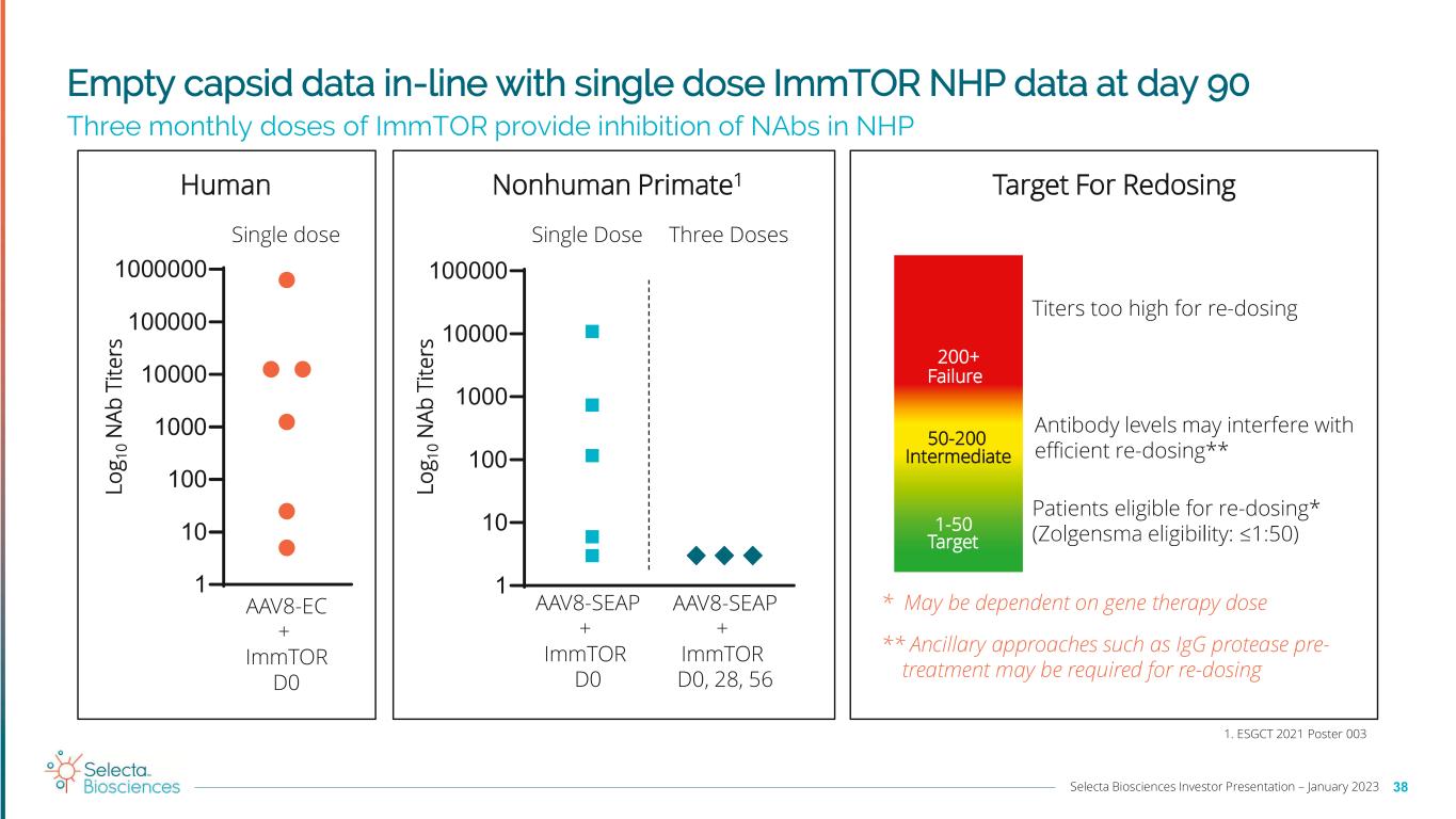 38Selecta Biosciences Investor Presentation – January 2023 Empty capsid data in-line with single dose ImmTOR NHP data at day 90 Three monthly doses of ImmTOR provide inhibition of NAbs in NHP Antibody levels may interfere with efficient re-dosing** Titers too high for re-dosing Patients eligible for re-dosing* * May be dependent on gene therapy dose ** Ancillary approaches such as IgG protease pre- treatment may be required for re-dosing AAV8-EC + ImmTOR D0 Single dose Human AAV8-SEAP + ImmTOR D0 AAV8-SEAP + ImmTOR D0, 28, 56 Single Dose Three Doses Nonhuman Primate1 1-50 50-200 200+ Target Intermediate Failure 1. ESGCT 2021 Poster 003 1 10 100 1000 10000 100000 1 10 100 1000 10000 100000 1000000 Target For Redosing