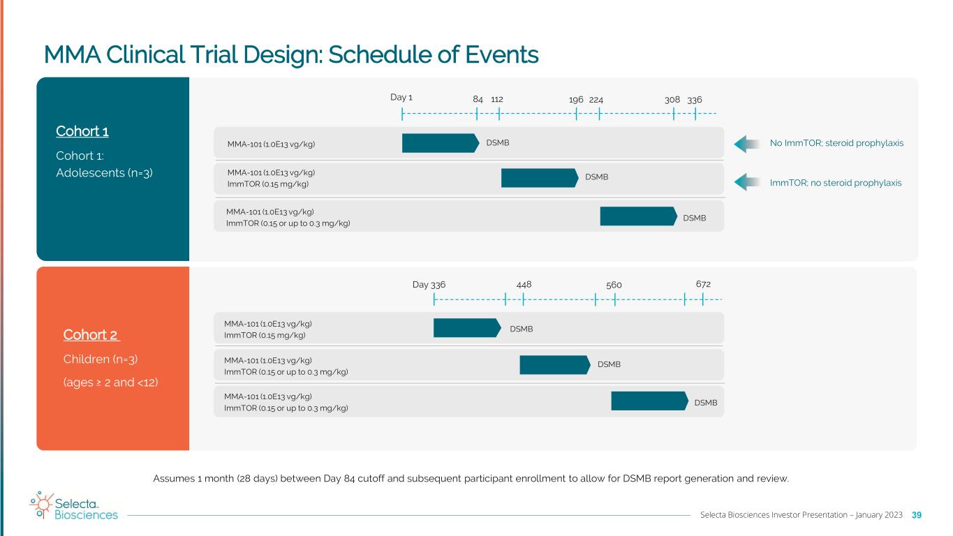 39Selecta Biosciences Investor Presentation – January 2023 Cohort 2 Children (n=3) Day 336 448 672560 Assumes 1 month (28 days) between Day 84 cutoff and subsequent participant enrollment to allow for DSMB report generation and review. MMA-101 (1.0E13 vg/kg) Cohort 1 Cohort 1: Adolescents (n=3) Day 1 DSMB DSMB 84 112 308 336196 224 No ImmTOR; steroid prophylaxis ImmTOR; no steroid prophylaxis MMA-101 (1.0E13 vg/kg) ImmTOR (0.15 mg/kg) MMA-101 (1.0E13 vg/kg) ImmTOR (0.15 or up to 0.3 mg/kg) DSMB MMA-101 (1.0E13 vg/kg) ImmTOR (0.15 mg/kg) MMA-101 (1.0E13 vg/kg) ImmTOR (0.15 or up to 0.3 mg/kg) MMA-101 (1.0E13 vg/kg) ImmTOR (0.15 or up to 0.3 mg/kg) DSMB DSMB DSMB MMA Clinical Trial Design: Schedule of Events