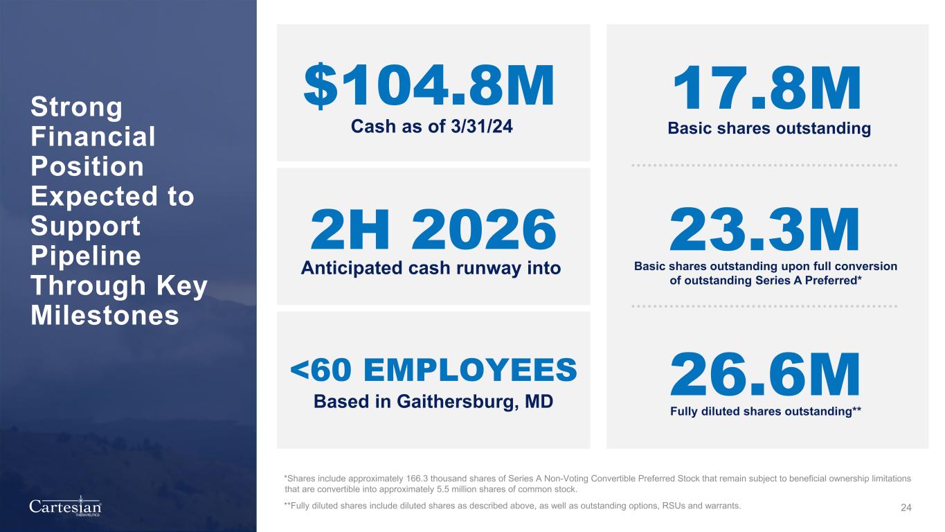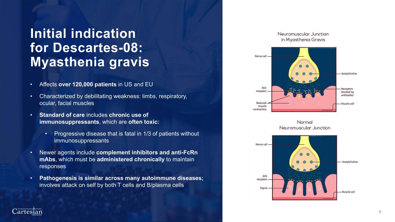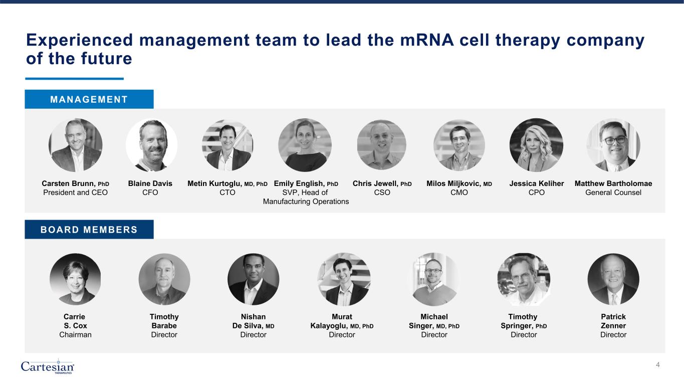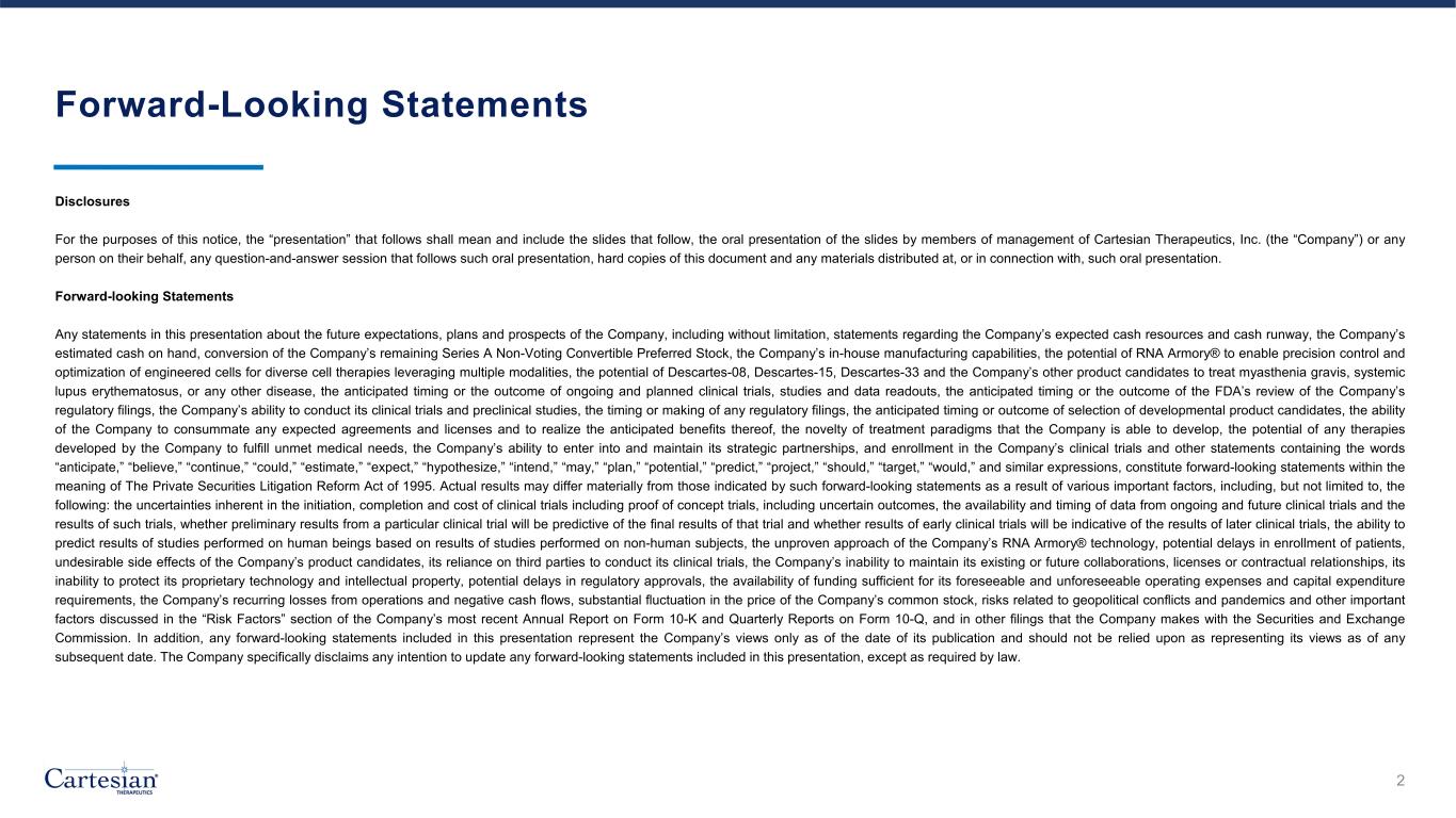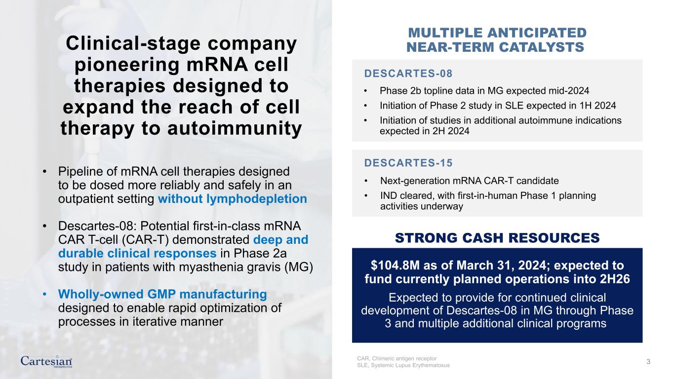 Forward-Looking Statements Disclosures For the purposes of this notice, the “presentation” that follows shall mean and include the slides that follow, the oral presentation of the slides by members of management of Cartesian Therapeutics, Inc. (the “Company”) or any person on their behalf, any question-and-answer session that follows such oral presentation, hard copies of this document and any materials distributed at, or in connection with, such oral presentation. Forward-looking Statements Any statements in this presentation about the future expectations, plans and prospects of the Company, including without limitation, statements regarding the Company’s expected cash resources and cash runway, the Company’s estimated cash on hand, conversion of the Company’s remaining Series A Non-Voting Convertible Preferred Stock, the Company’s in-house manufacturing capabilities, the potential of RNA Armory® to enable precision control and optimization of engineered cells for diverse cell therapies leveraging multiple modalities, the potential of Descartes-08, Descartes-15, Descartes-33 and the Company’s other product candidates to treat myasthenia gravis, systemic lupus erythematosus, or any other disease, the anticipated timing or the outcome of ongoing and planned clinical trials, studies and data readouts, the anticipated timing or the outcome of the FDA’s review of the Company’s regulatory filings, the Company’s ability to conduct its clinical trials and preclinical studies, the timing or making of any regulatory filings, the anticipated timing or outcome of selection of developmental product candidates, the ability of the Company to consummate any expected agreements and licenses and to realize the anticipated benefits thereof, the novelty of treatment paradigms that the Company is able to develop, the potential of any therapies developed by the Company to fulfill unmet medical needs, the Company’s ability to enter into and maintain its strategic partnerships, and enrollment in the Company’s clinical trials and other statements containing the words “anticipate,” “believe,” “continue,” “could,” “estimate,” “expect,” “hypothesize,” “intend,” “may,” “plan,” “potential,” “predict,” “project,” “should,” “target,” “would,” and similar expressions, constitute forward-looking statements within the meaning of The Private Securities Litigation Reform Act of 1995. Actual results may differ materially from those indicated by such forward-looking statements as a result of various important factors, including, but not limited to, the following: the uncertainties inherent in the initiation, completion and cost of clinical trials including proof of concept trials, including uncertain outcomes, the availability and timing of data from ongoing and future clinical trials and the results of such trials, whether preliminary results from a particular clinical trial will be predictive of the final results of that trial and whether results of early clinical trials will be indicative of the results of later clinical trials, the ability to predict results of studies performed on human beings based on results of studies performed on non-human subjects, the unproven approach of the Company’s RNA Armory® technology, potential delays in enrollment of patients, undesirable side effects of the Company’s product candidates, its reliance on third parties to conduct its clinical trials, the Company’s inability to maintain its existing or future collaborations, licenses or contractual relationships, its inability to protect its proprietary technology and intellectual property, potential delays in regulatory approvals, the availability of funding sufficient for its foreseeable and unforeseeable operating expenses and capital expenditure requirements, the Company’s recurring losses from operations and negative cash flows, substantial fluctuation in the price of the Company’s common stock, risks related to geopolitical conflicts and pandemics and other important factors discussed in the “Risk Factors” section of the Company’s most recent Annual Report on Form 10-K and Quarterly Reports on Form 10-Q, and in other filings that the Company makes with the Securities and Exchange Commission. In addition, any forward-looking statements included in this presentation represent the Company’s views only as of the date of its publication and should not be relied upon as representing its views as of any subsequent date. The Company specifically disclaims any intention to update any forward-looking statements included in this presentation, except as required by law. 2