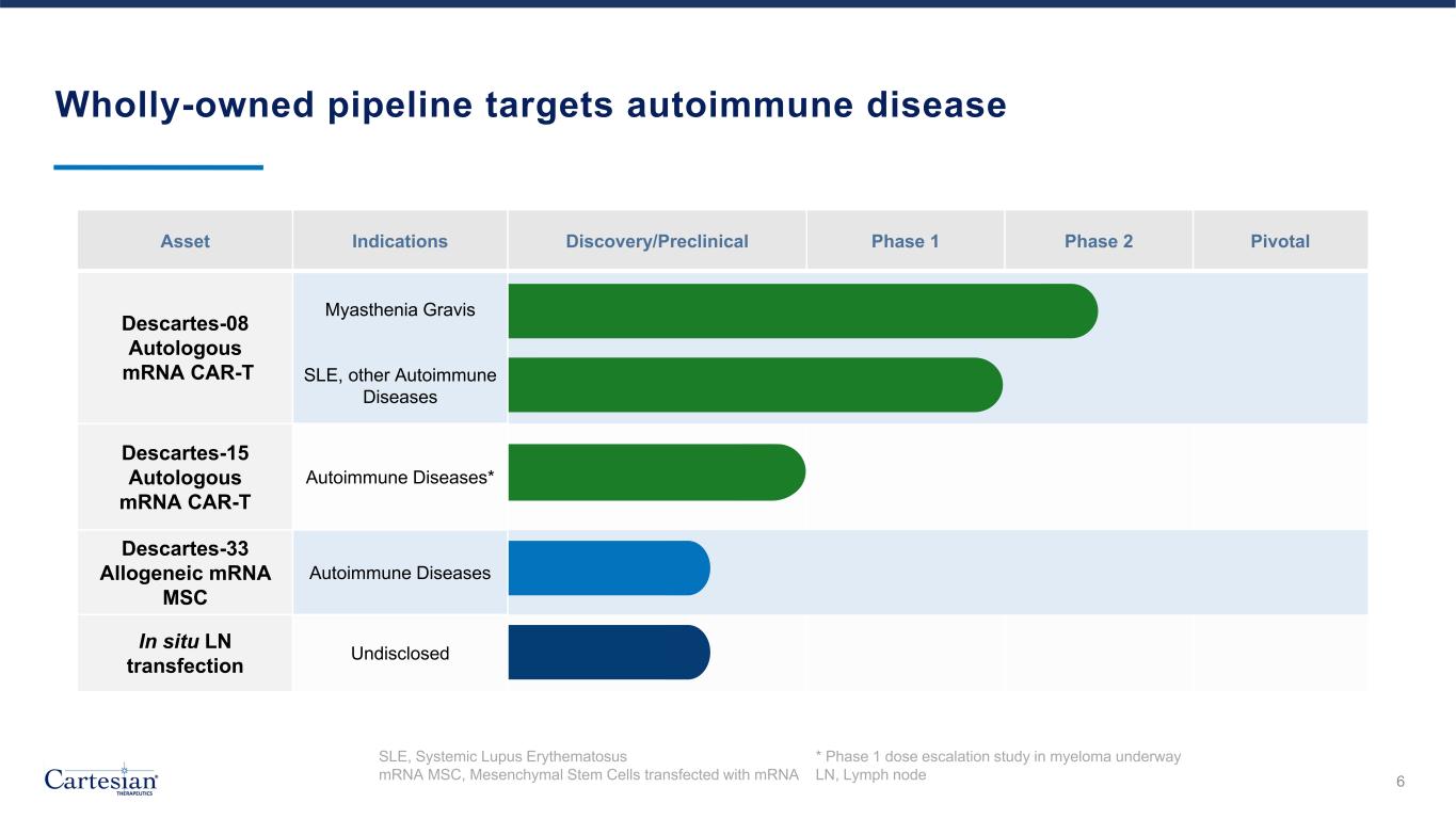 Cartesian’s mRNA approach is designed to expand the reach of potent cell therapy products to address potential autoimmune indications 5 Requires Lymphodepleting Chemotherapy Associated with high rates of toxicity, including cytokine release syndrome Conventional DNA Cell Therapy Permanent Cell Modification Associated with insertional mutagenesis leading to potential secondary malignancies Uncontrollable PK/PD Effector function of cell therapy engineered with DNA amplifies exponentially with cell replication Administered at Subtherapeutic Levels Cells proliferate rapidly beyond therapeutic window Requires Inpatient Administration High patient burden resulting in higher indirect costs Subtherapeutic Therapeutic window Toxicity C A R + C el ls Time  mRNA Cell Therapy No Lymphodepleting Chemotherapy Required No requirement for cell proliferation  no expected need for pre-treatment chemotherapy  no Grade 3-4 cytopenias Transient Cell Modification Does not carry risk of genomic integration Controllable PK/PD mRNA does not replicate  predictable half-life with more controllable PK/PD defined by the dose Delivered at Therapeutic Levels Expectation for cells to be administered at therapeutic, but sub-toxic doses Administered Outpatient Reduced patient burden and lower indirect cost Toxicity C A R + C el ls 6 Doses Therapeutic window Subtherapeutic Time  ® THERAPEUTICS
