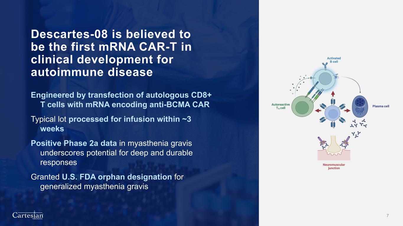 Wholly-owned pipeline targets autoimmune disease SLE, Systemic Lupus Erythematosus * Phase 1 dose escalation study in myeloma underway mRNA MSC, Mesenchymal Stem Cells transfected with mRNA LN, Lymph node Asset Indications Discovery/Preclinical Phase 1 Phase 2 Pivotal Descartes-08 Autologous mRNA CAR-T Myasthenia Gravis SLE, other Autoimmune Diseases Descartes-15 Autologous mRNA CAR-T Autoimmune Diseases* Descartes-33 Allogeneic mRNA MSC Autoimmune Diseases In situ LN transfection Undisclosed 6