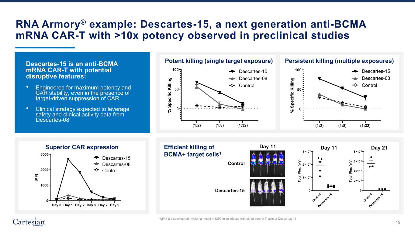 RNA Armory® example: Descartes-15, a next generation anti-BCMA mRNA CAR-T with >10x potency observed in preclinical studies Potent killing (single target exposure) Persistent killing (multiple exposures) (1:2) (1:8) (1:32) 0 50 100 % S pe ci fic K ill in g DC-15 DC-08 Vehicle EP escartes-08 escartes-15 Control (1:2) (1:8) (1:32) 0 50 100 % S pe ci fic K ill in g DC-15 DC-08 Vehicle EP escartes-08 escartes-15 Control Descartes-15 is an anti-BCMA mRNA CAR-T with potential disruptive features: • Engineered for maximum potency and CAR stability, even in the presence of target-driven suppression of CAR • Clinical strategy expected to leverage safety and clinical activity data from Descartes-08 Day 0 Day 1 Day 2 Day 5 Day 7 Day 9 0 1000 2000 3000 M FI DC-15 DC-08 Vehicle EP escartes-08 escartes-15 Control Superior CAR expression Contro l Des ca rte s-1 5 0 2×108 4×108 6×108 8×108 Day 21 To ta l F lu x (p /s ) Control Descartes-15 Contro l Des ca rte s-1 5 0 1×107 2×107 3×107 Day 11 To ta l F lu x (p /s ) Day 21Day 11Efficient killing of BCMA+ target cells1 Day 11 1 MM1-S disseminated myeloma model in NSG mice infused with either control T-cells or Descartes-15 19